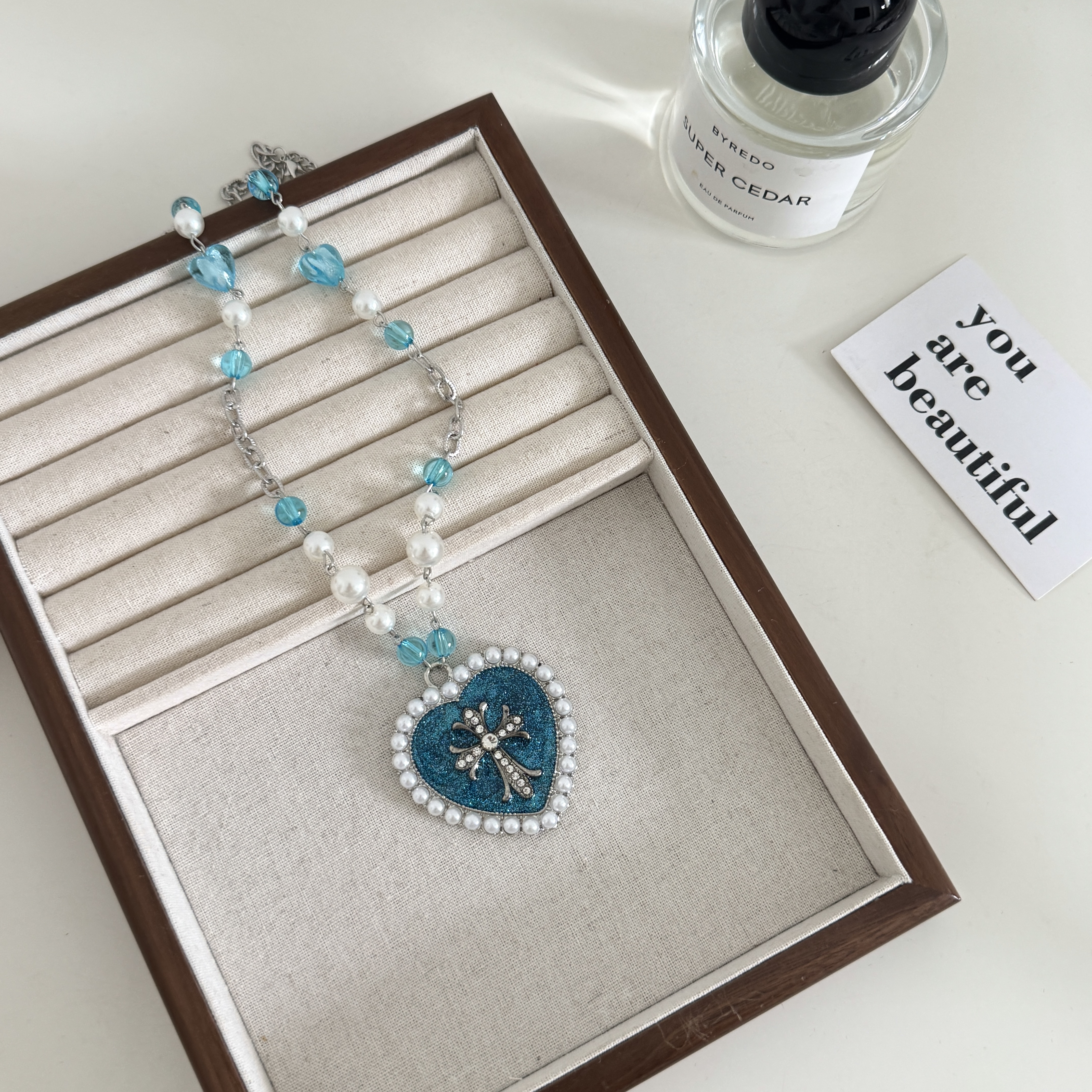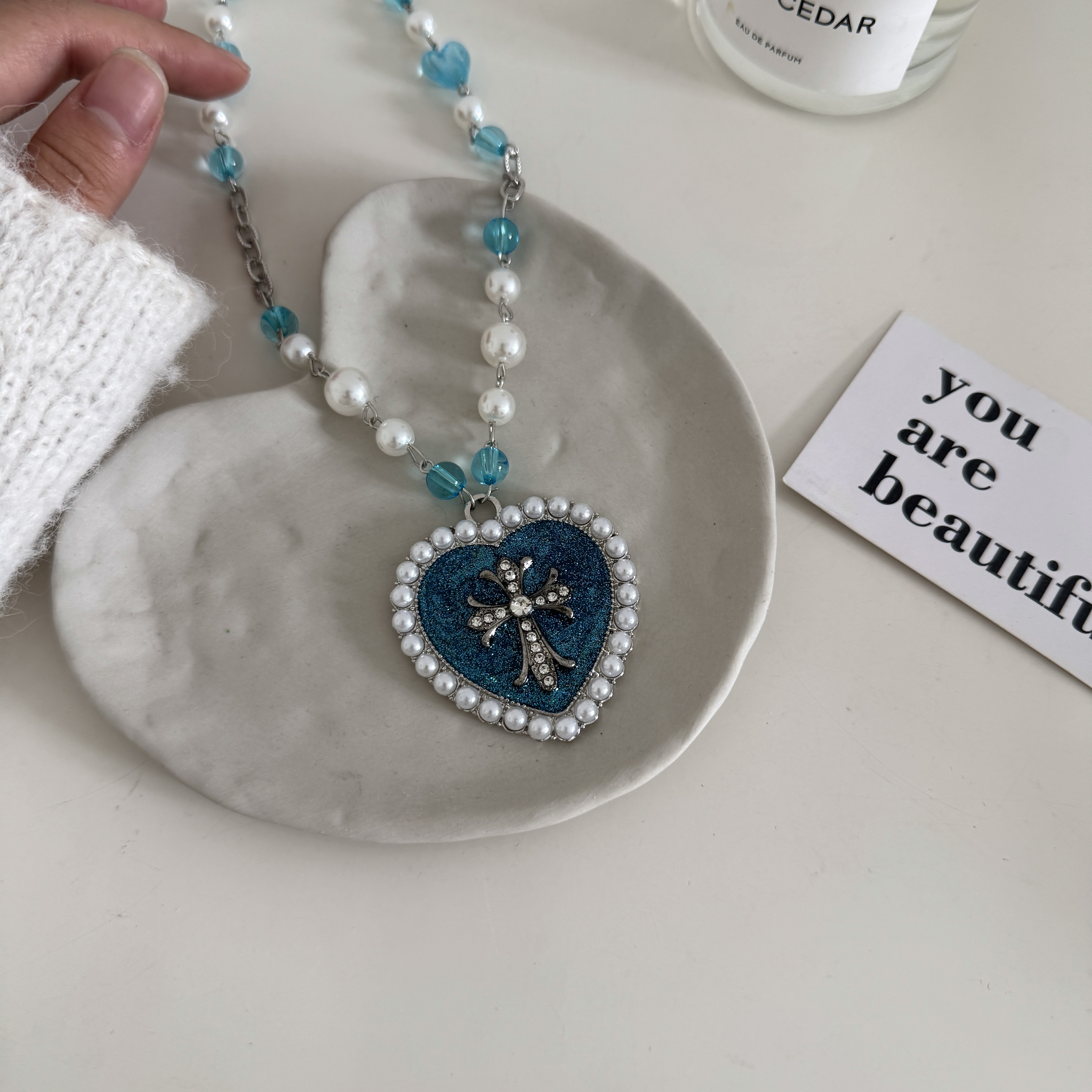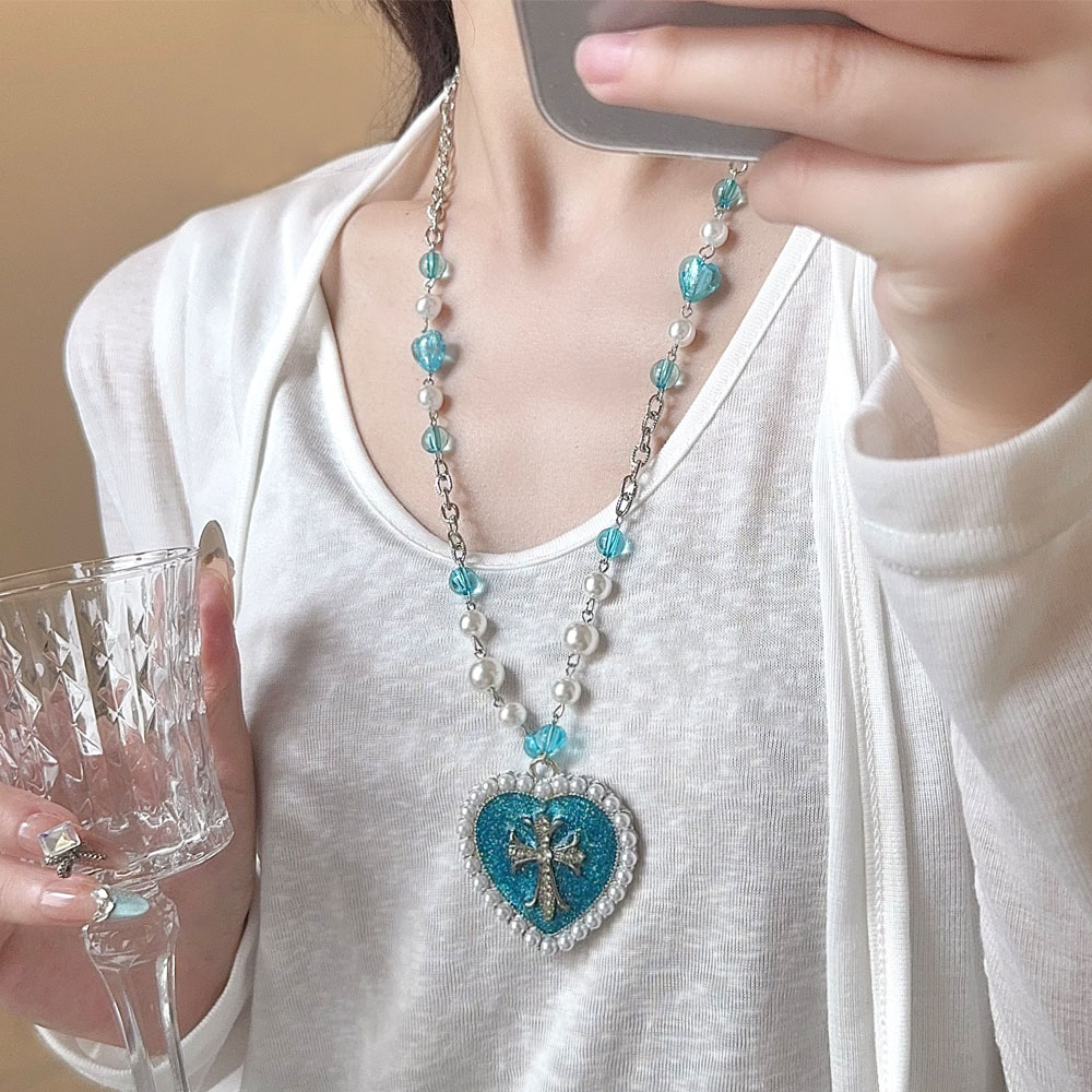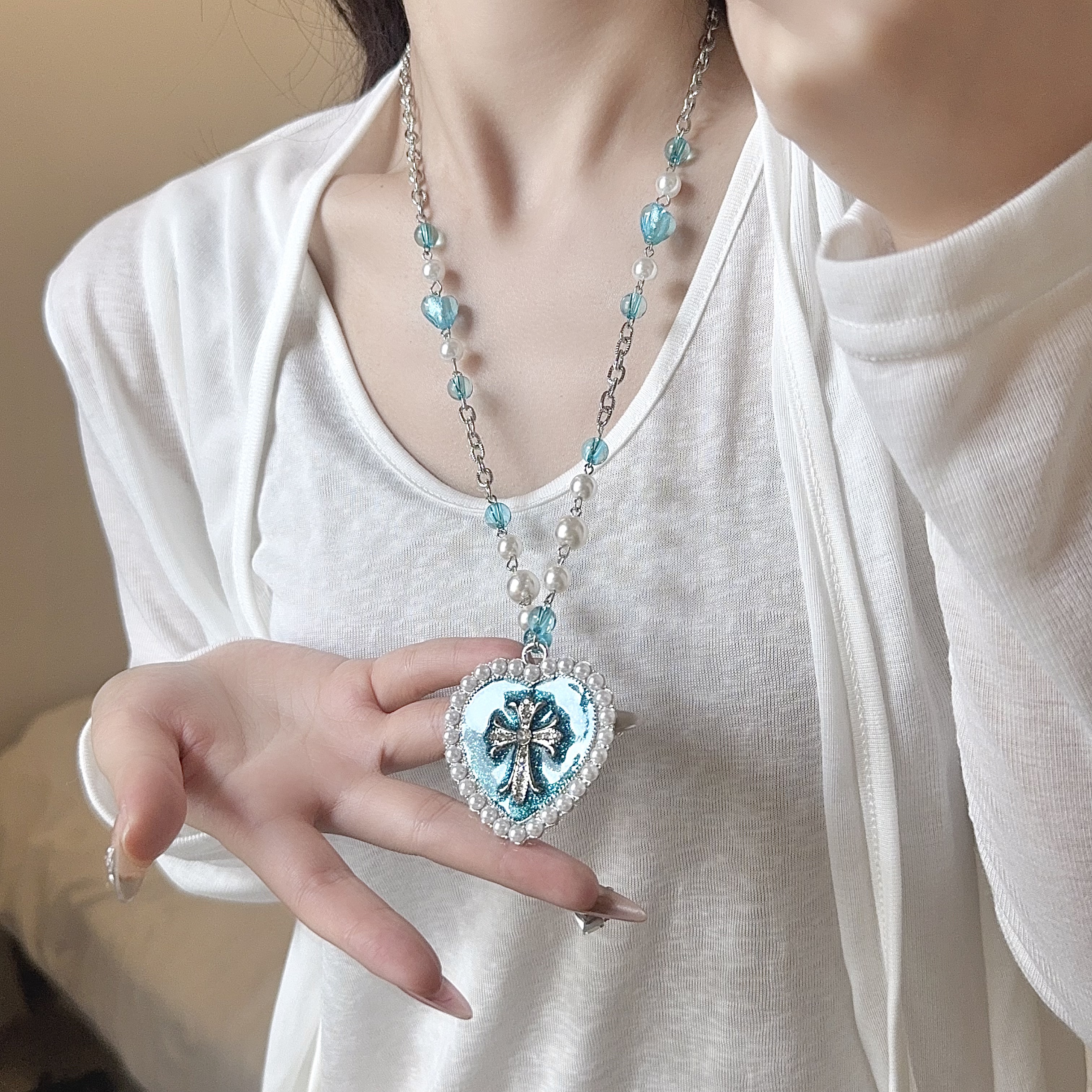 个性蓝色滴油爱心十字架吊坠项链长款时尚气质清冷感锁骨链毛衣链