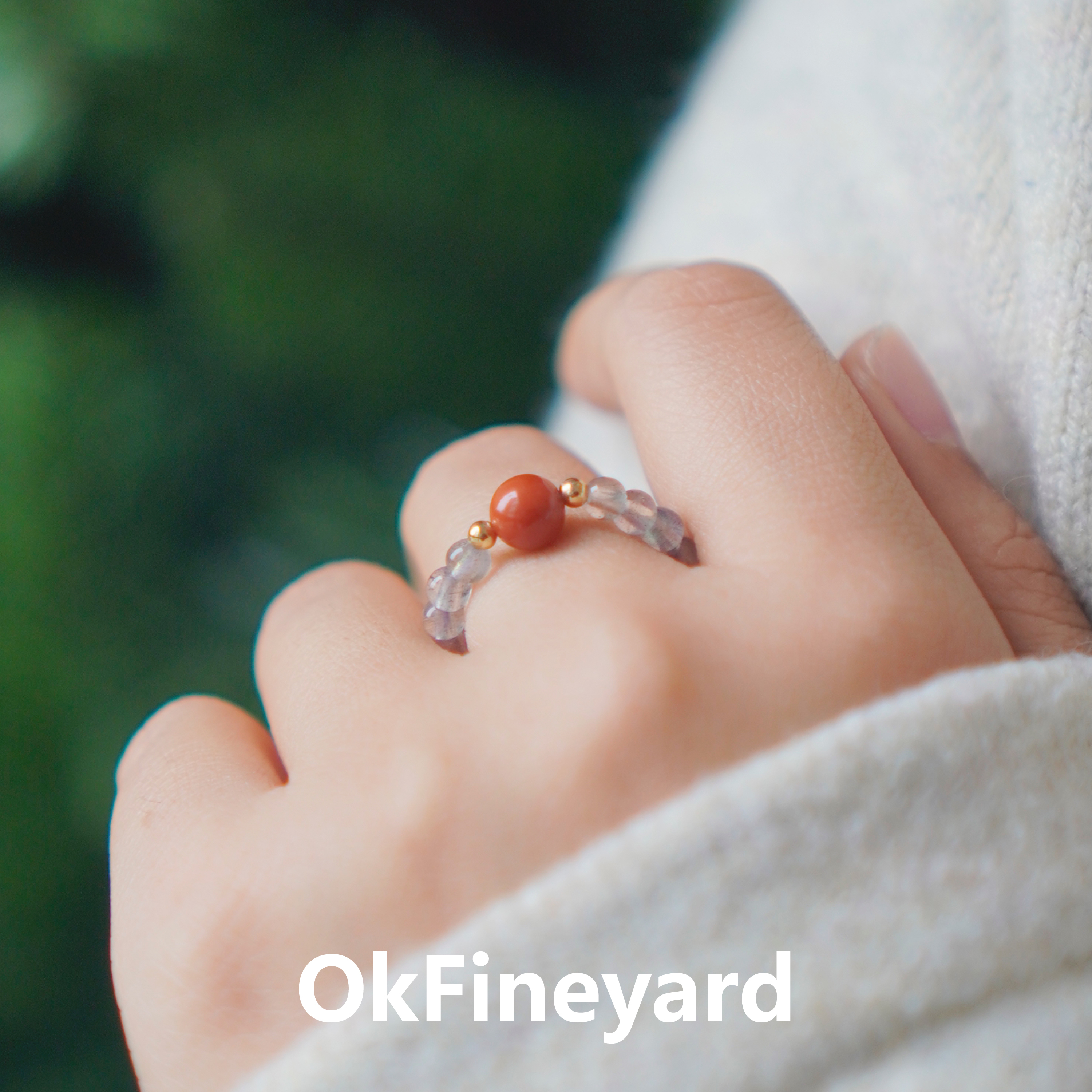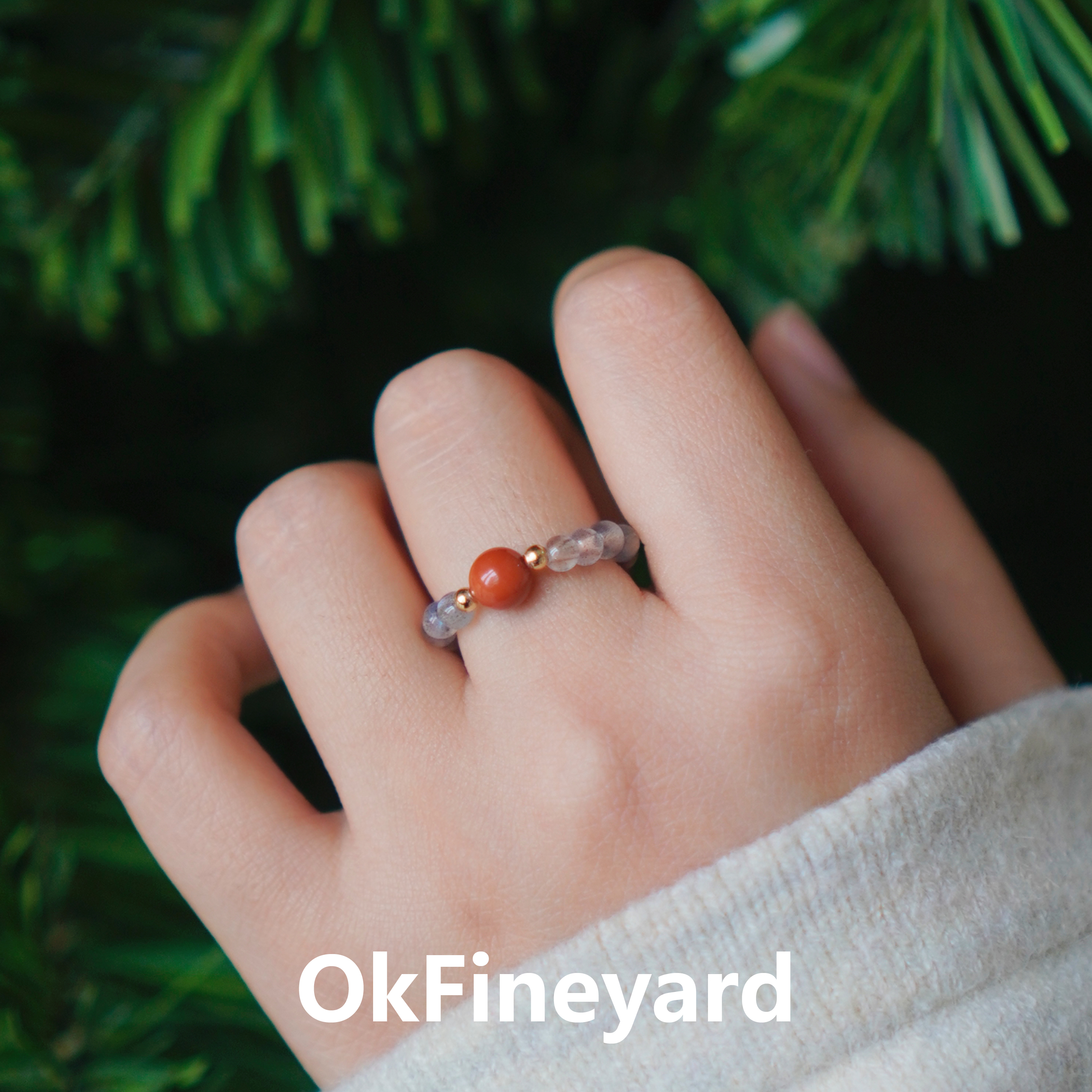 OkFineyard天然南红玛瑙戒指女灰月光石串珠小众高级尾戒弹力指环