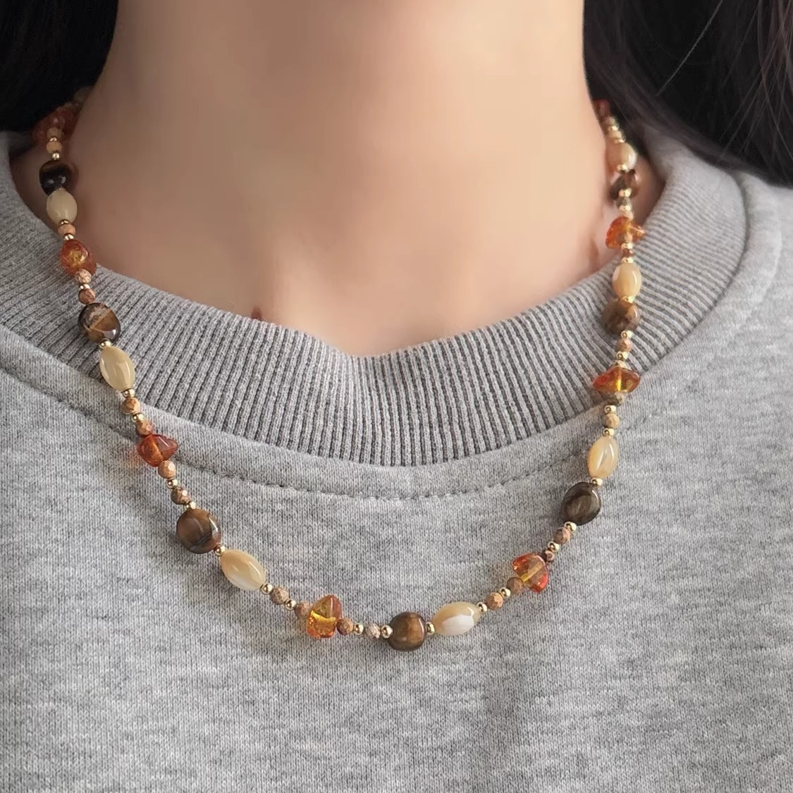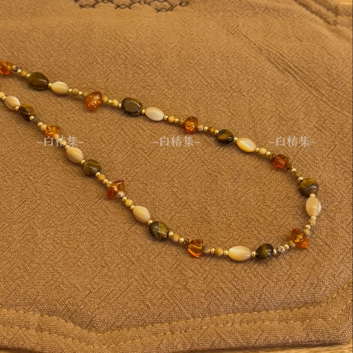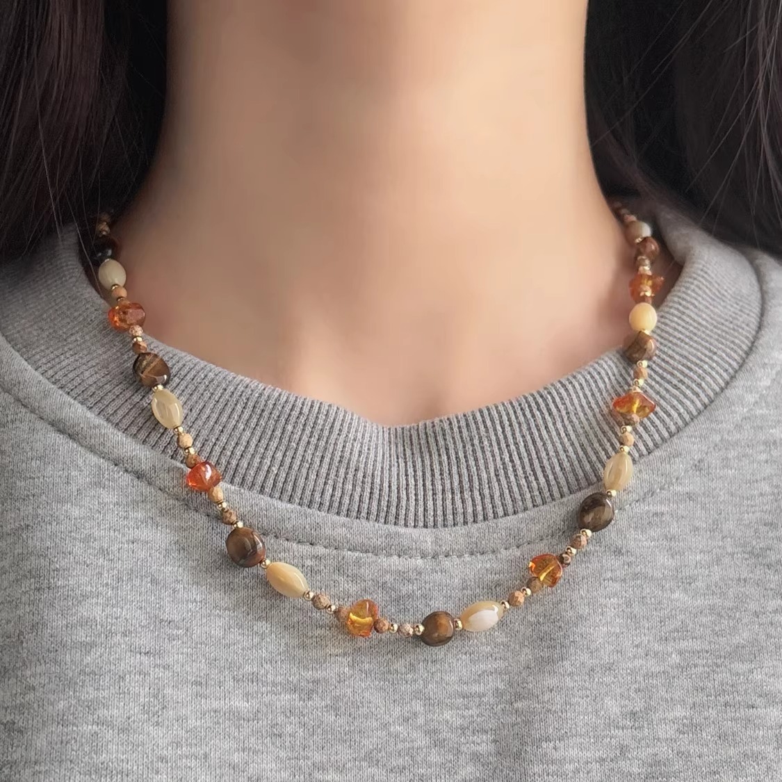新中式虎眼石玛瑙项链小众高级感复古美拉德天然石母贝串珠锁骨链