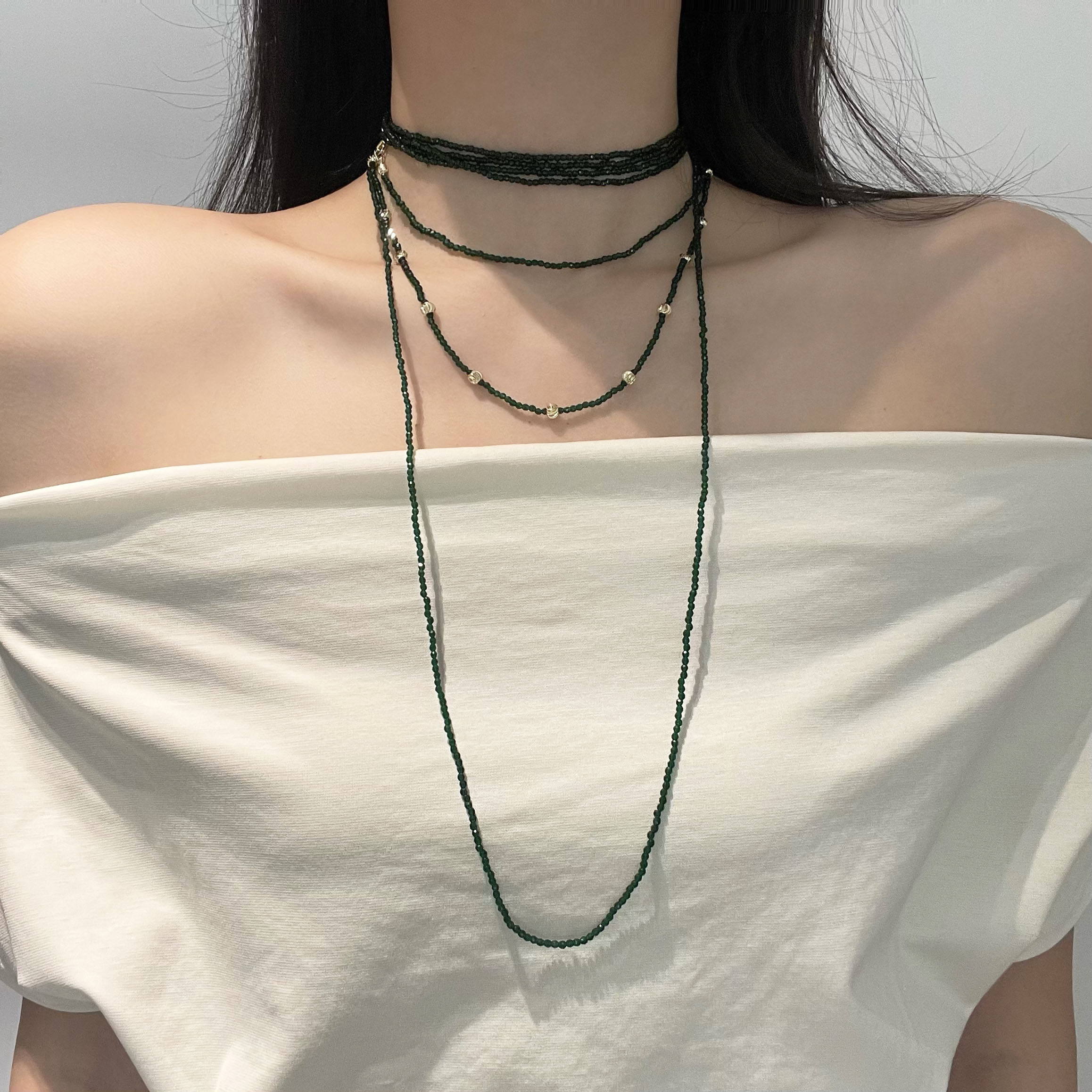 复古绿色水晶串多层项链女小众设计长流苏叠戴锁骨链气质时尚配饰