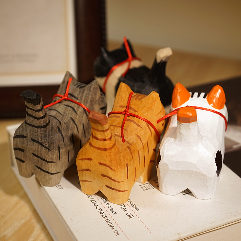 铃铛翘尾巴猫咪手工木雕小摆件可爱卡通办公桌面装饰品治愈好物