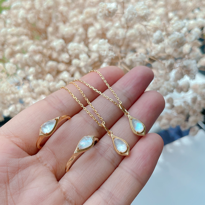 日系新品夜光贝石英水滴冰透天然白贝母白水晶纯银镀金戒指女手饰