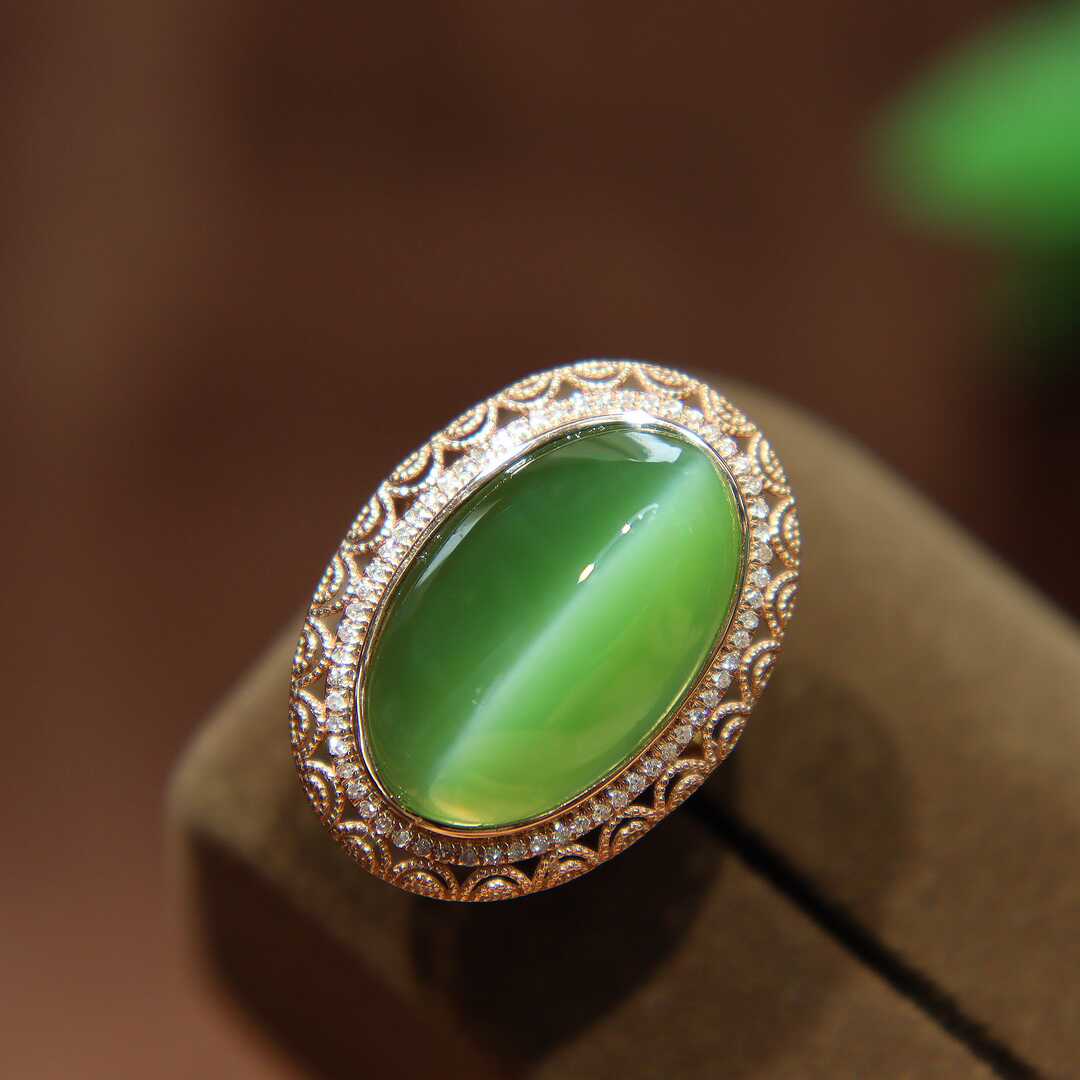 夏季新品和田玉戒指女猫眼碧玉蛋面18K金戒指镶嵌天然玉石翡翠戒