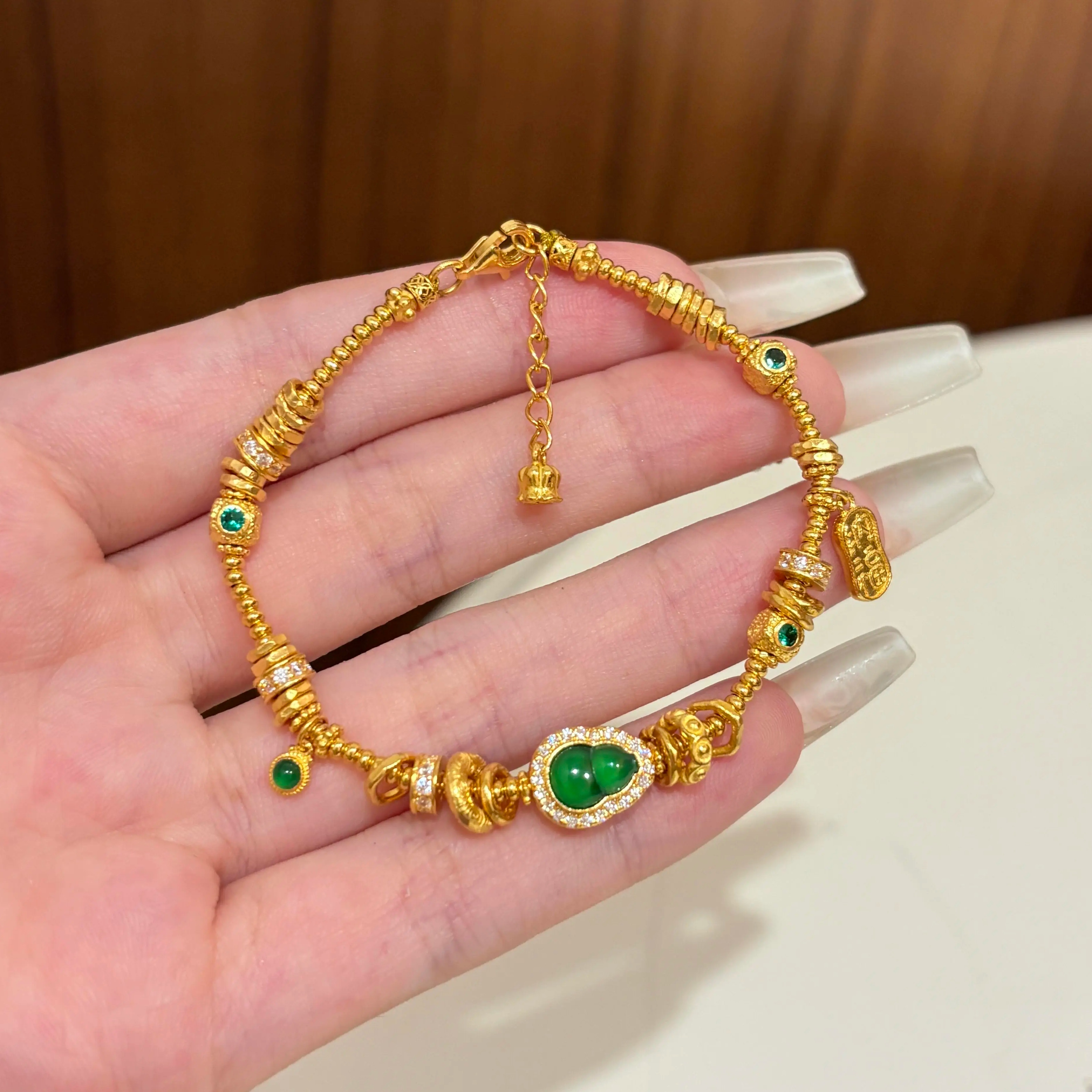 水贝黄金古法手串点钻绿葫芦跑环手链足金999送女友礼物diy可定制
