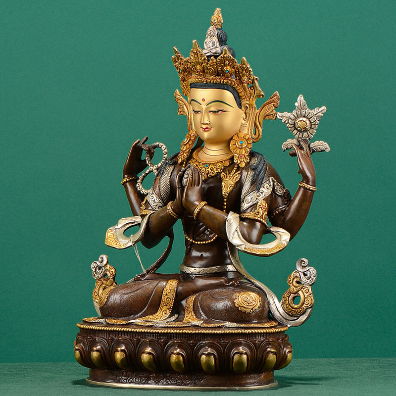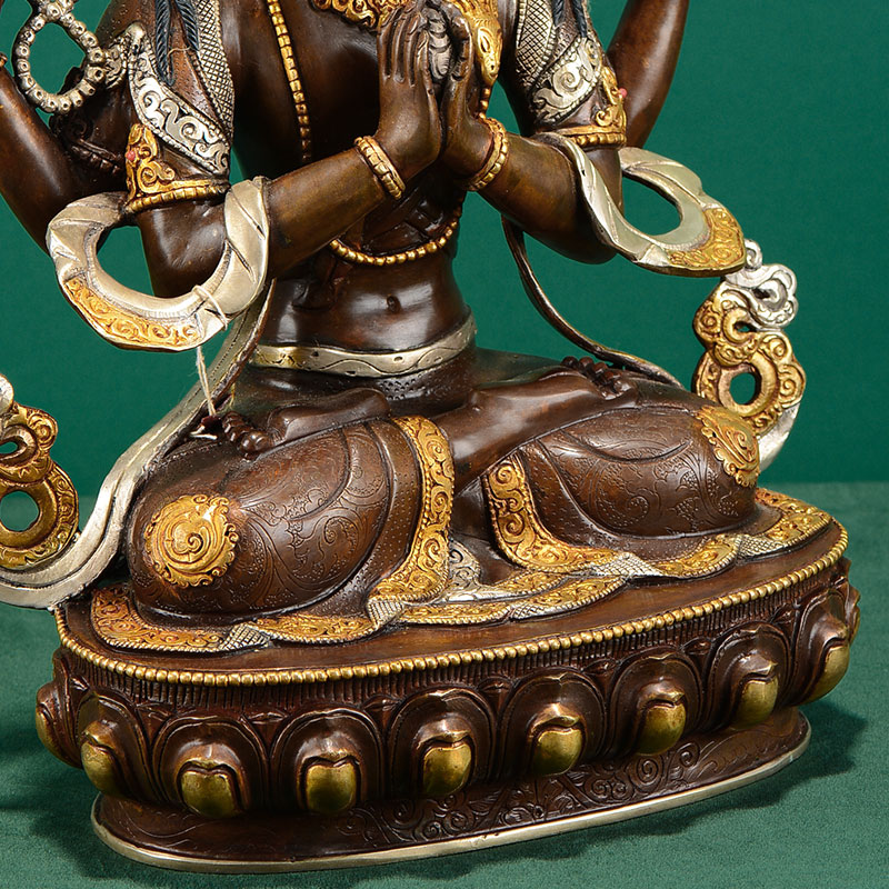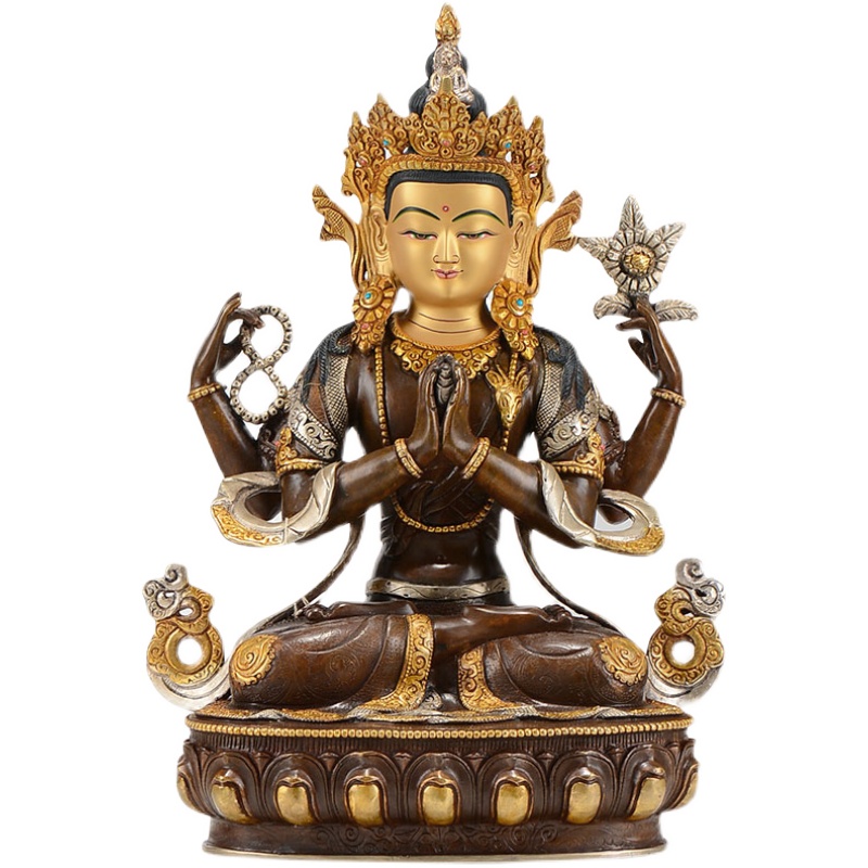 四臂观音菩萨摆件尼泊尔10寸紫铜鎏金鎏银家用桌面铜铜像