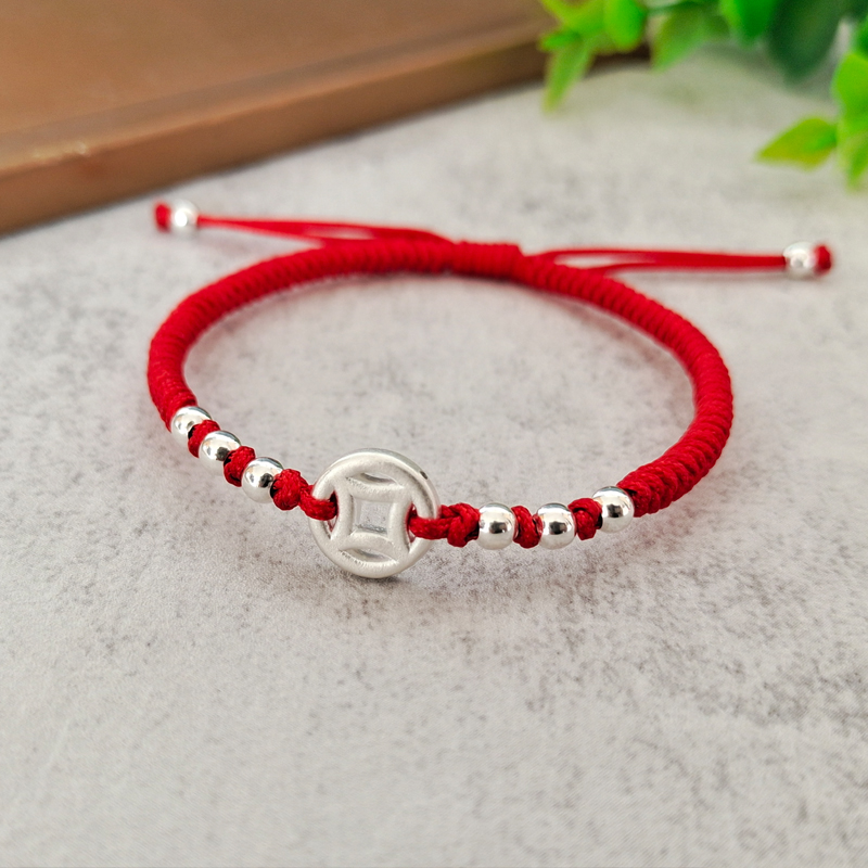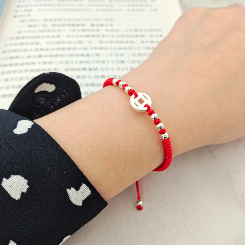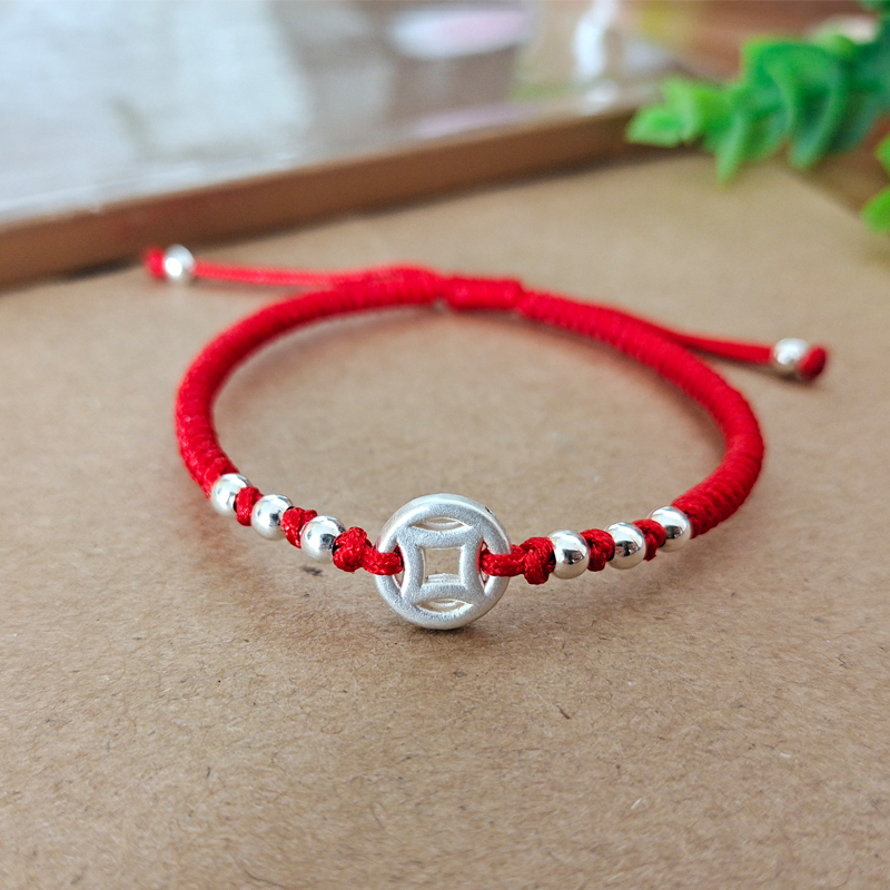 999足银方孔钱币手编手链幸运珠本命年红绳男女情侣礼物手绳脚链