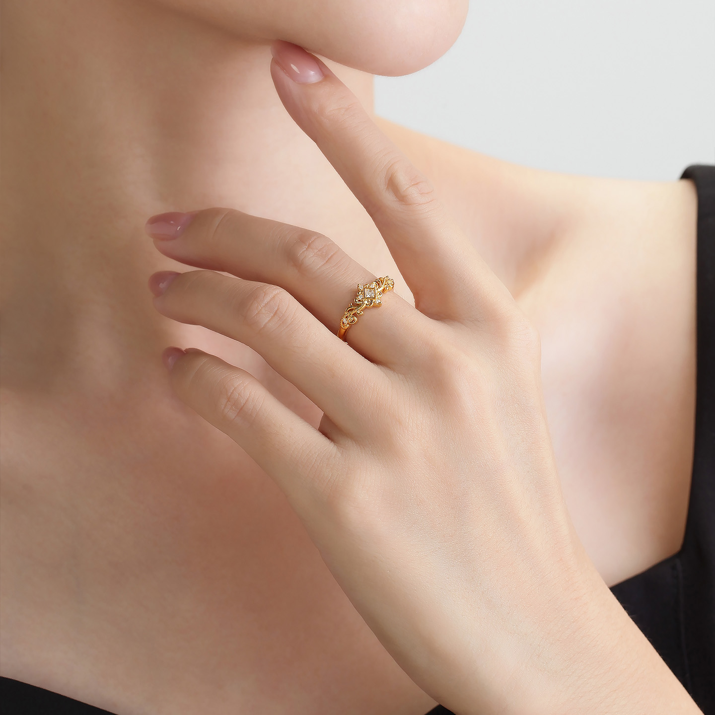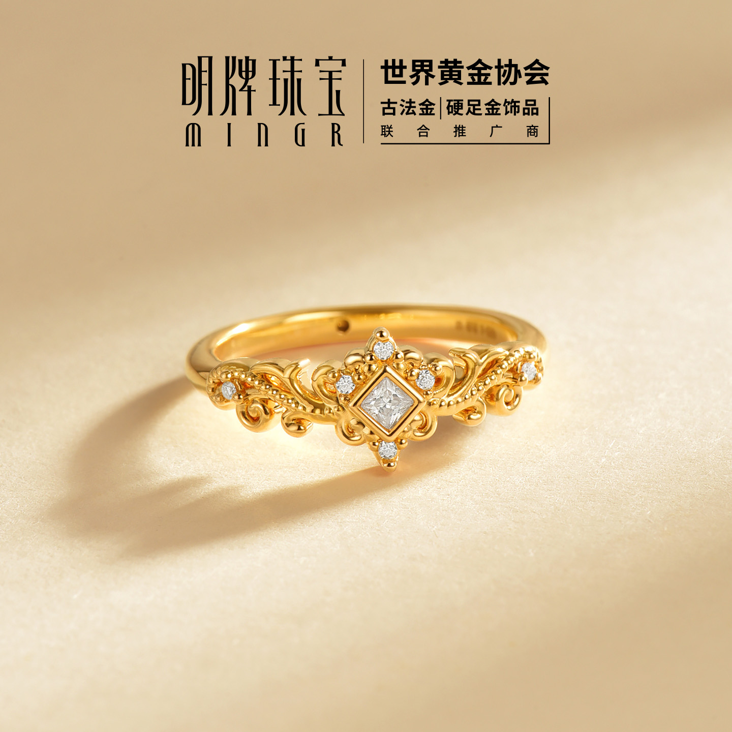 明牌珠宝蔓影流光硬金戒指 黄金莫桑钻镶嵌卷草纹固口指环AFM0440