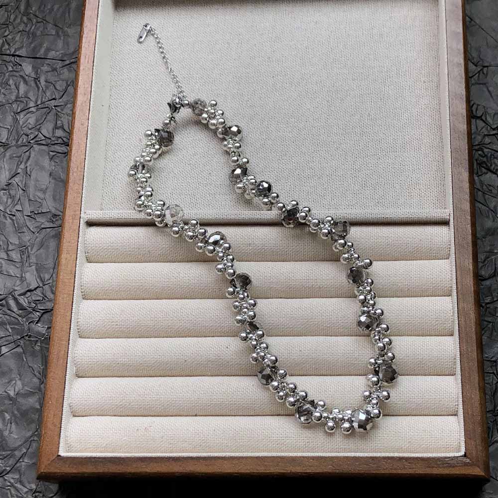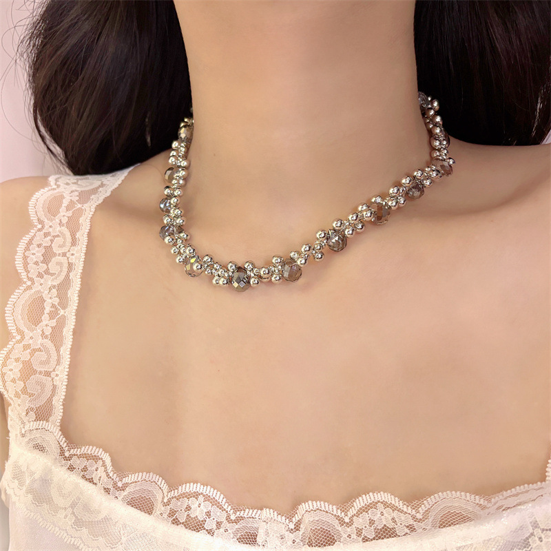 甜酷辣妹风银色金属球拼接灰色水晶串珠项链女轻奢高级感锁骨颈链