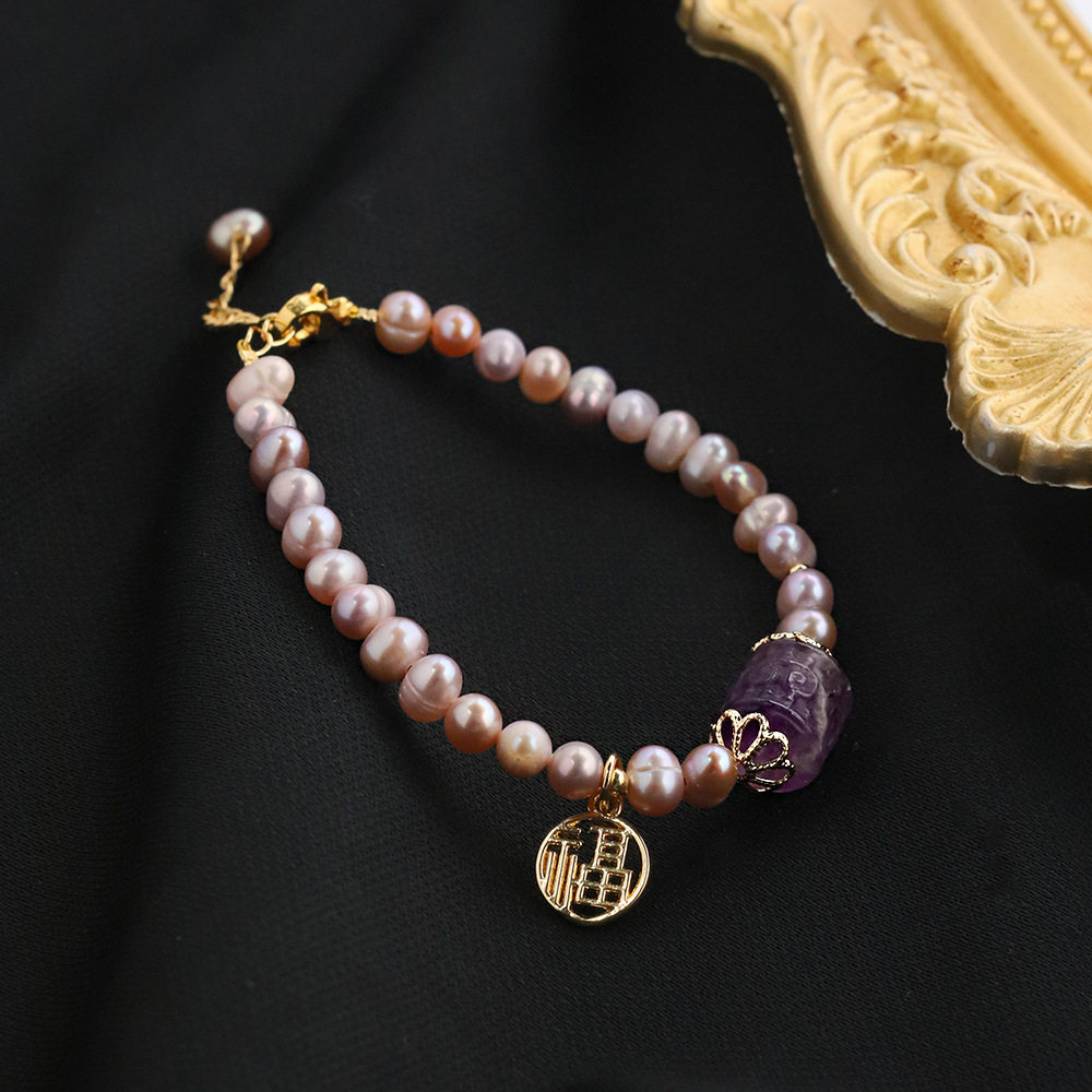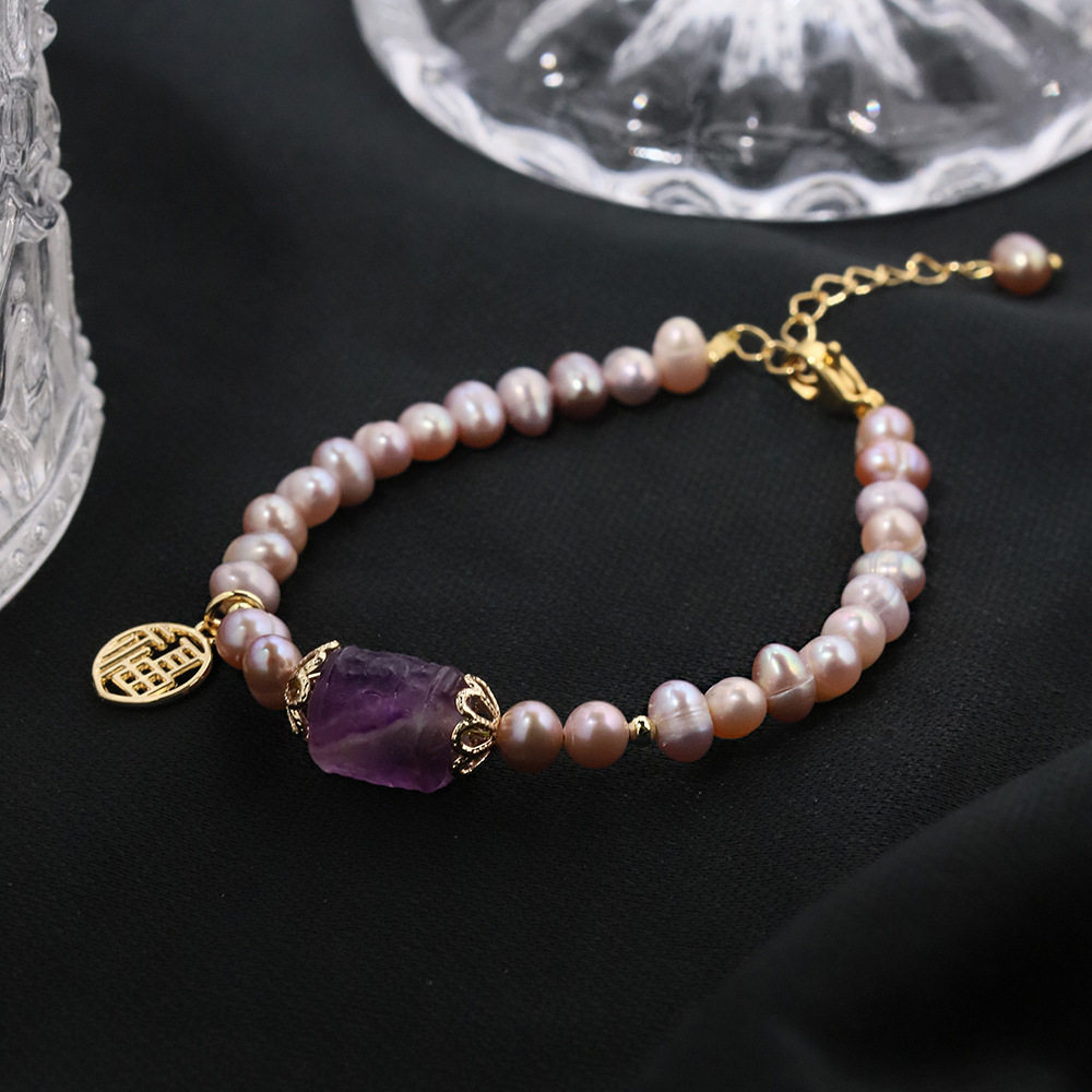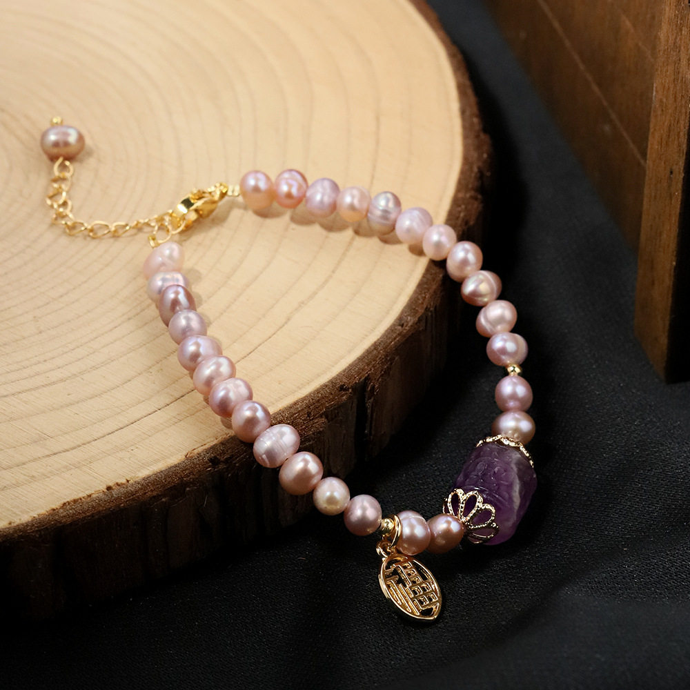 天然淡水紫色珍珠项链回纹路手链福牌套装高级感送闺蜜轻奢礼物