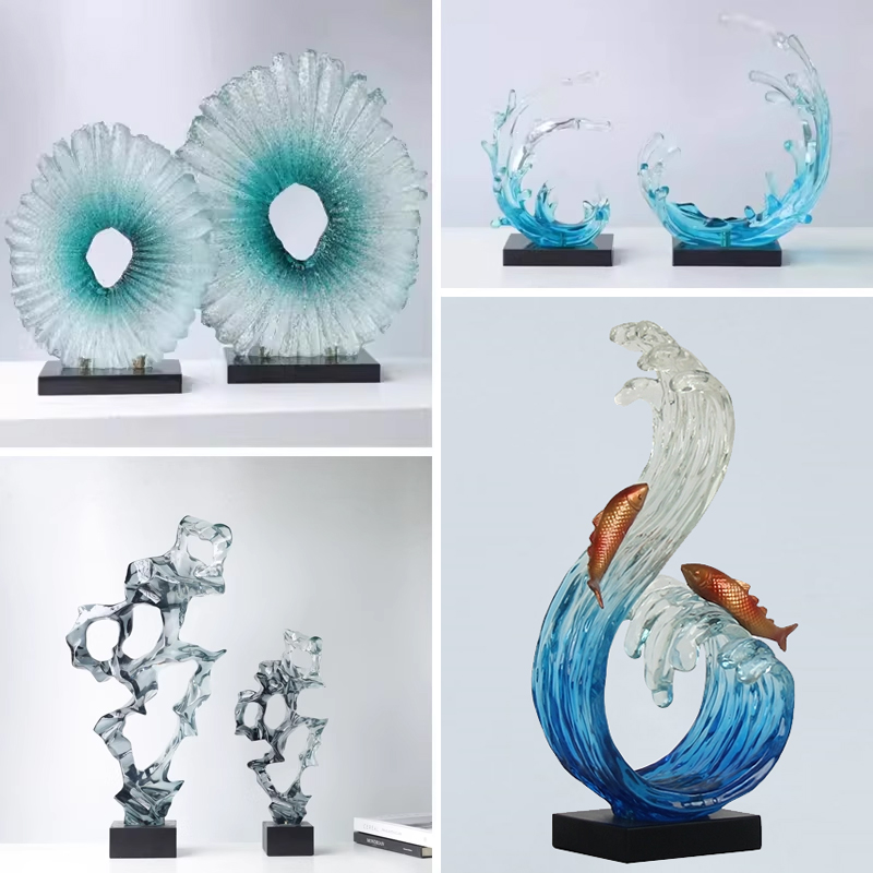 现代简约透明艺术雕塑蓝色浪花太湖石摆件酒店大堂玄关招财装饰品