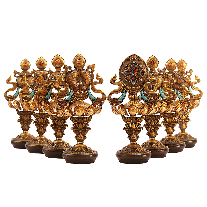 藏传用品八瑞物八吉祥摆件吉祥八宝套装供奉组合大小黄铜家用摆件