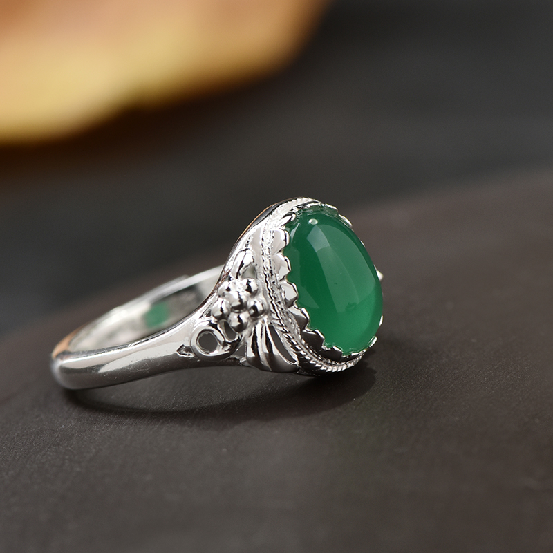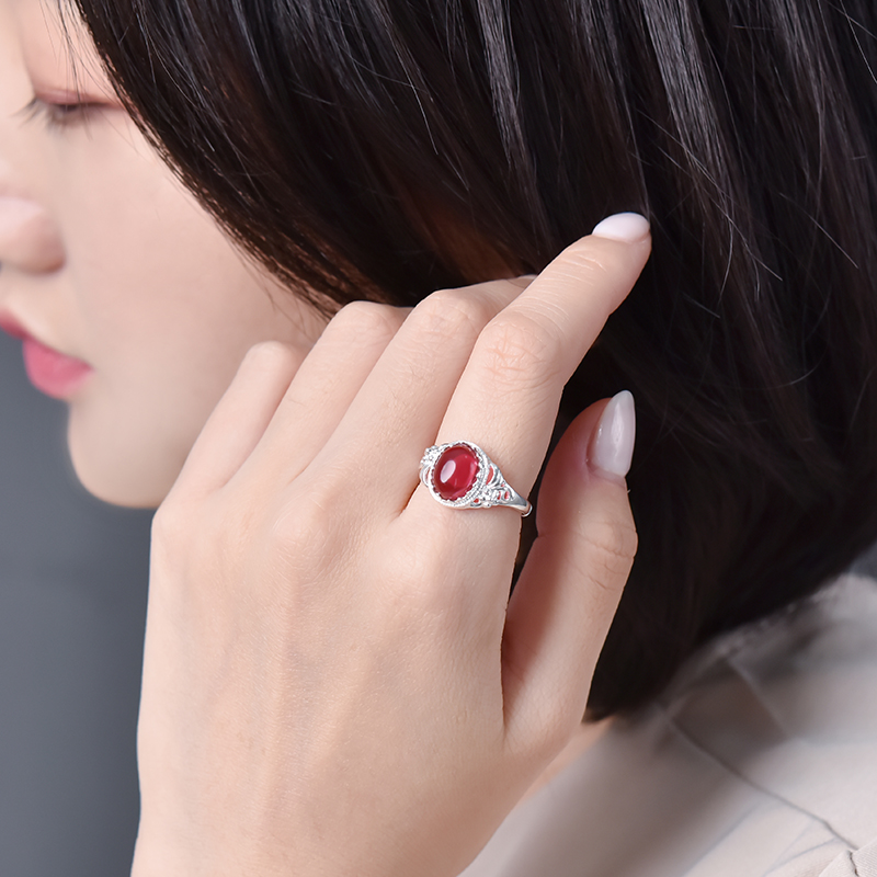 红玛瑙戒指女999纯银祖母绿玉髓镶嵌指环复古开口宝石戒子送妈妈