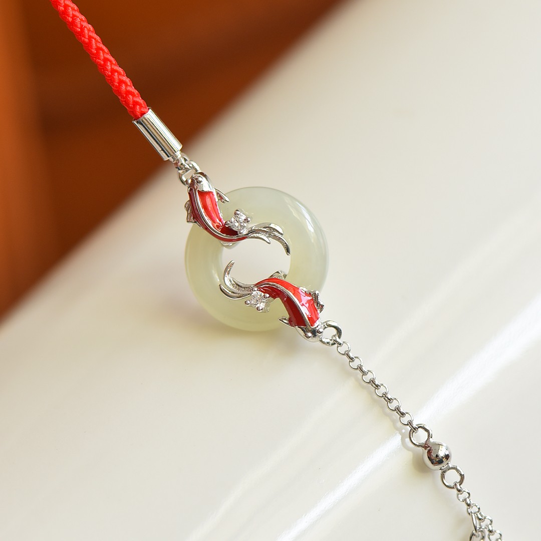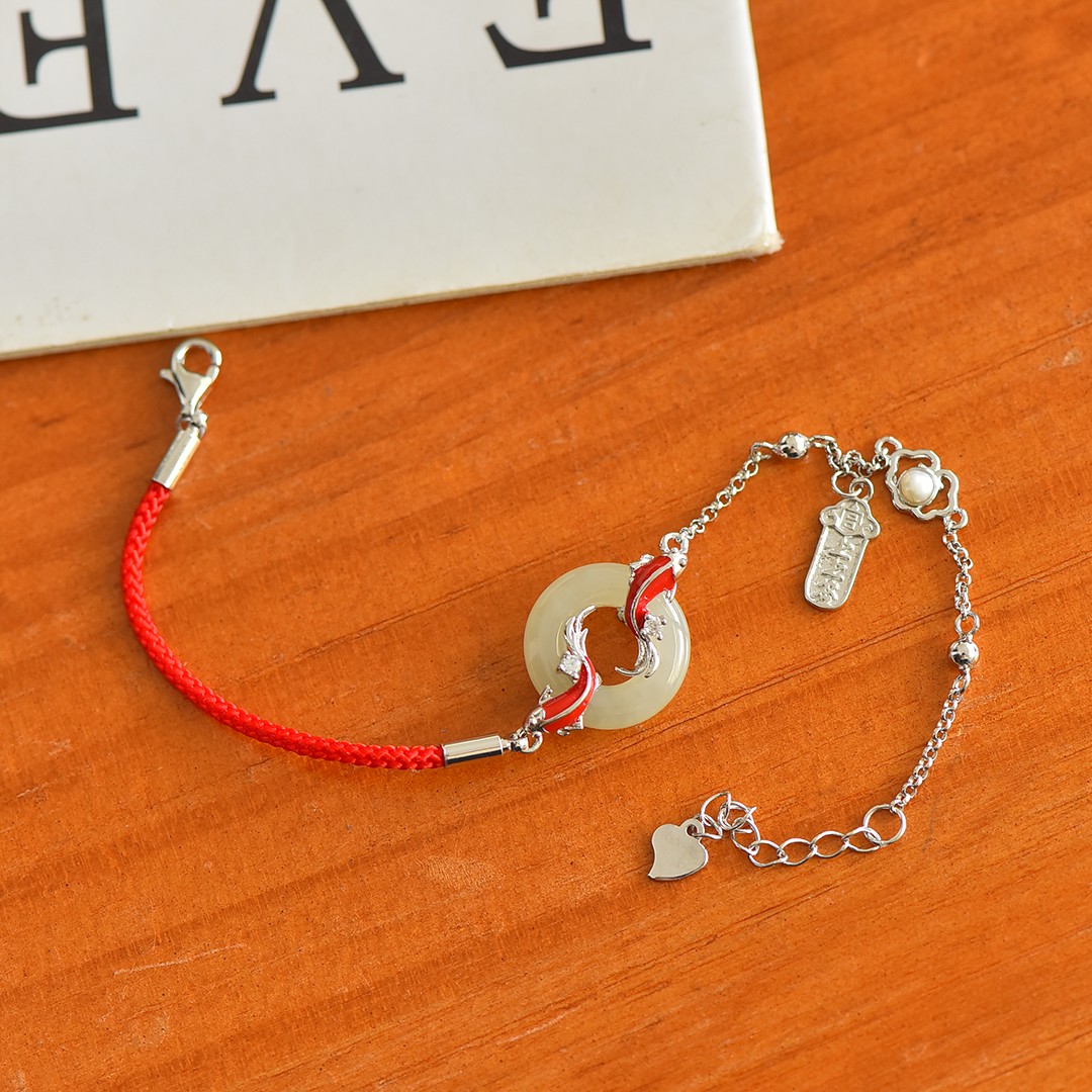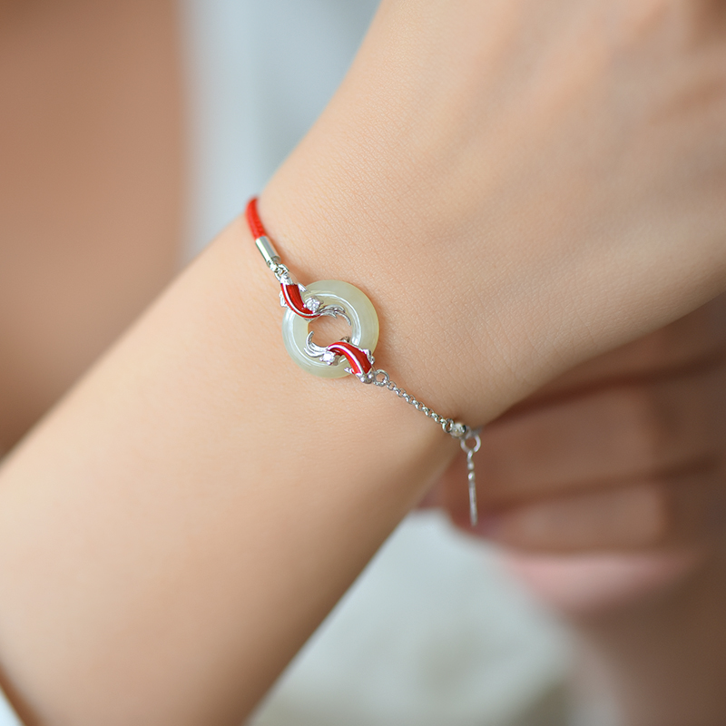 S925银镀18K金镶嵌天然新疆和田玉平安环手链女款时尚高档大气