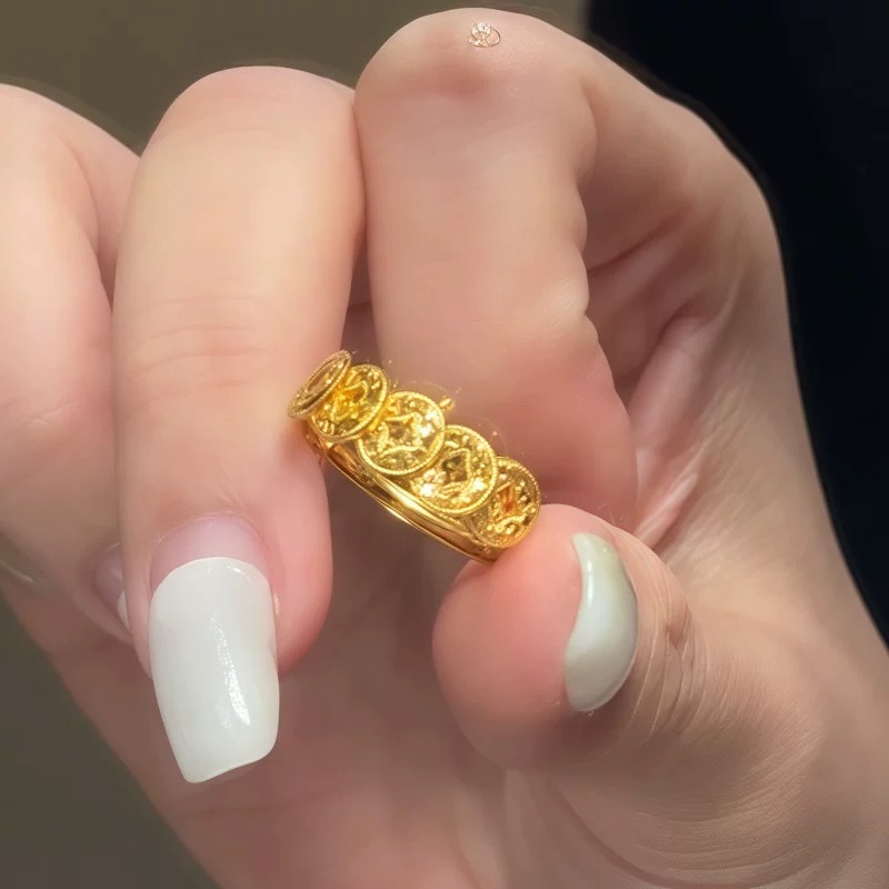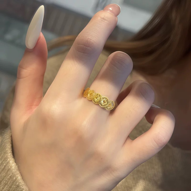 五帝钱币沙金戒指女爆闪钱多多仿真黄金点钻轻奢食指戒开口指环