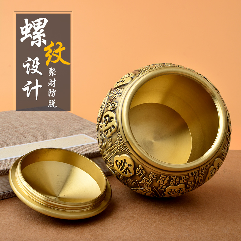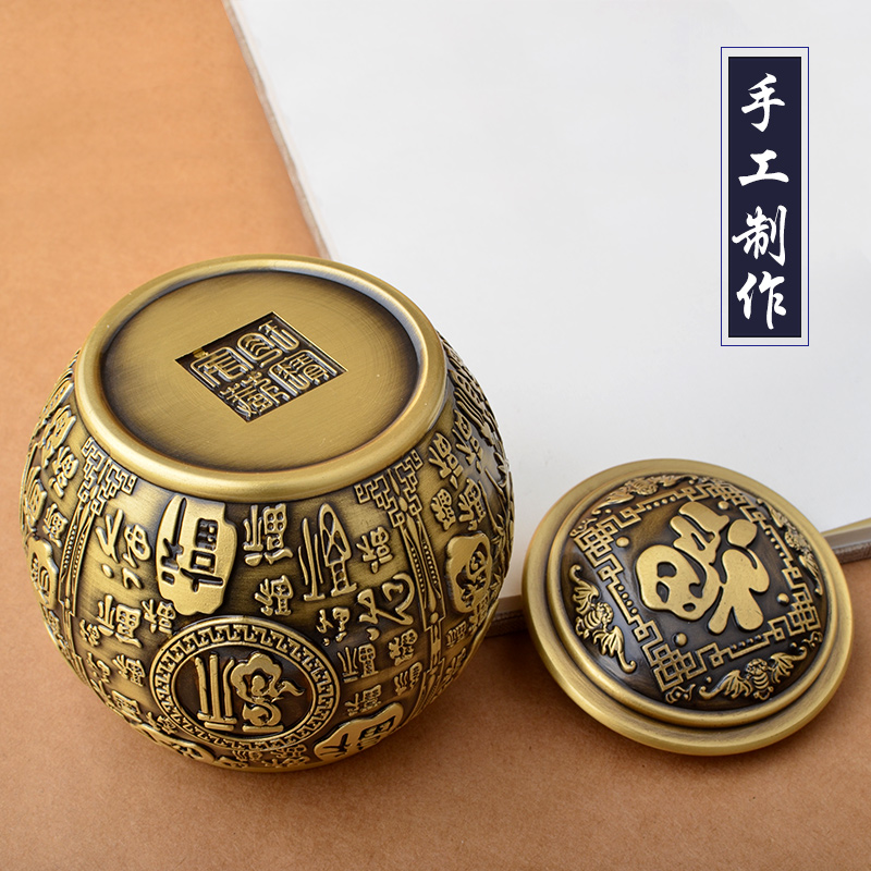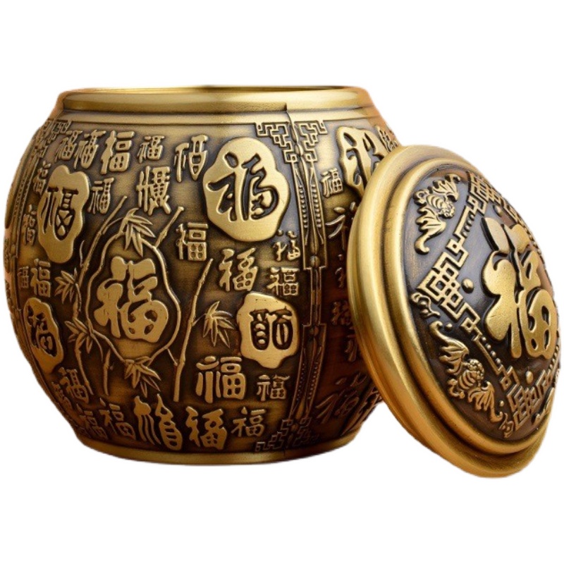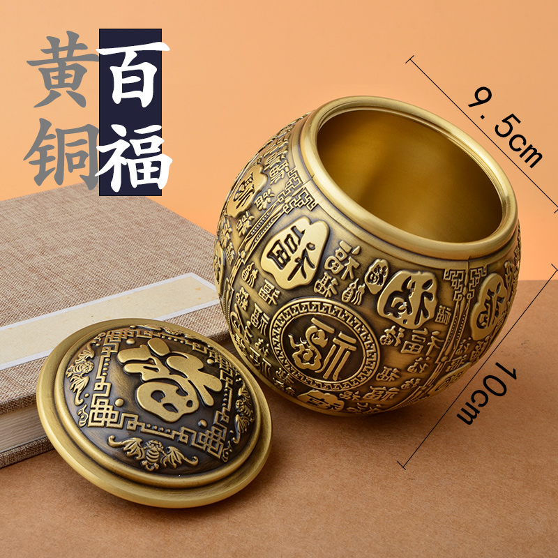 黄铜百福茶叶罐聚宝盆创意米缸办公室桌面小摆件烟灰缸书房装饰品