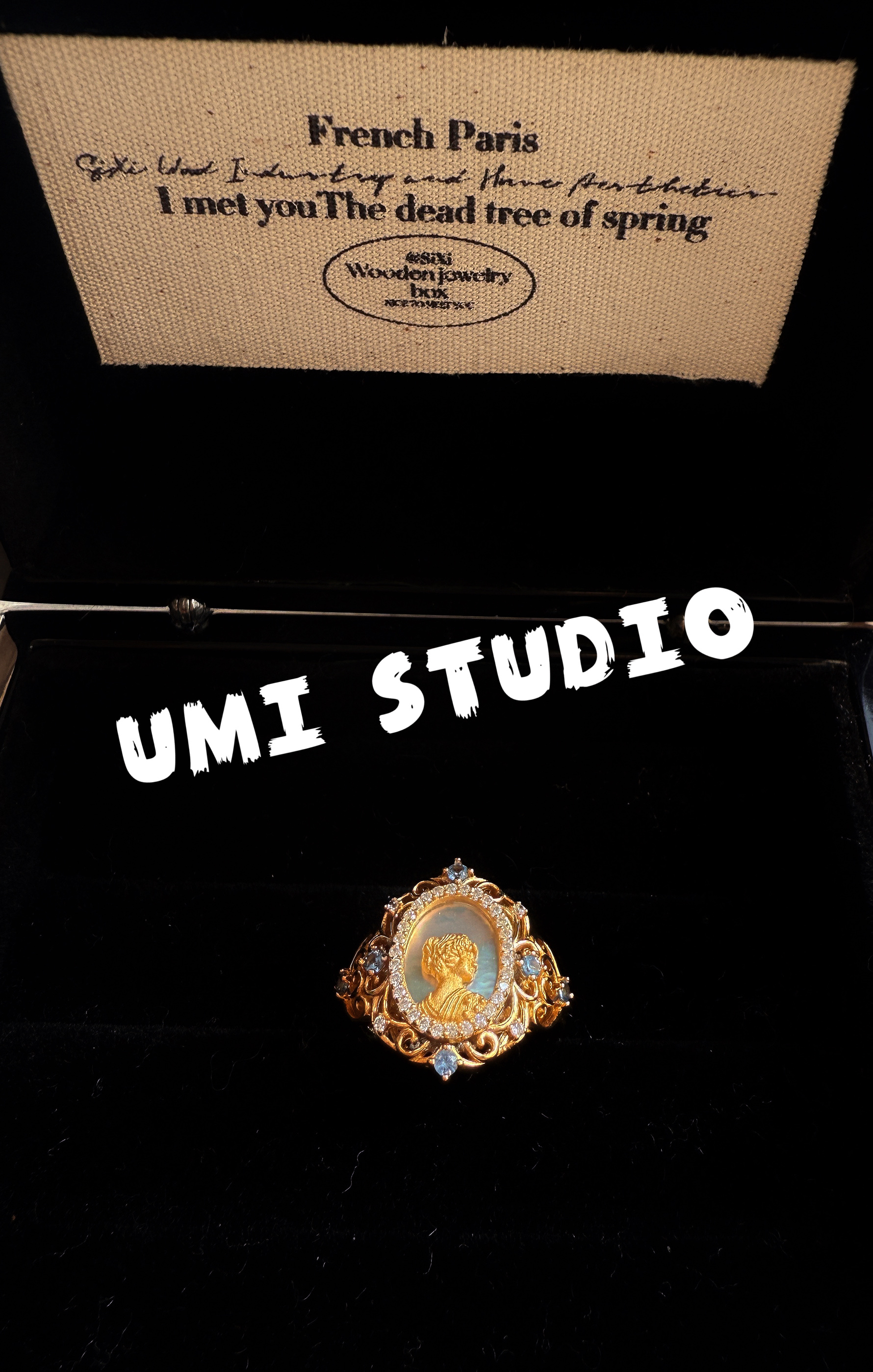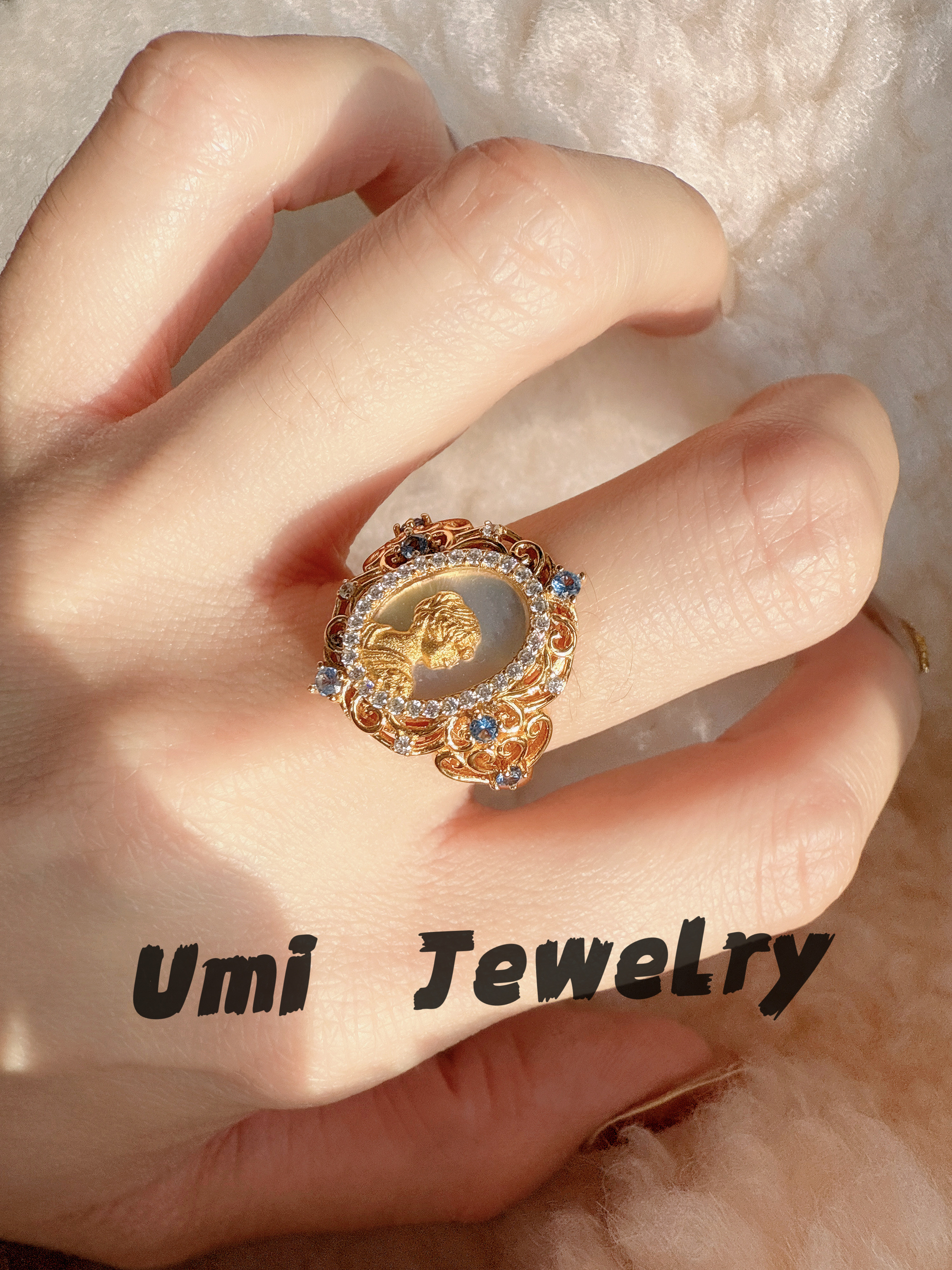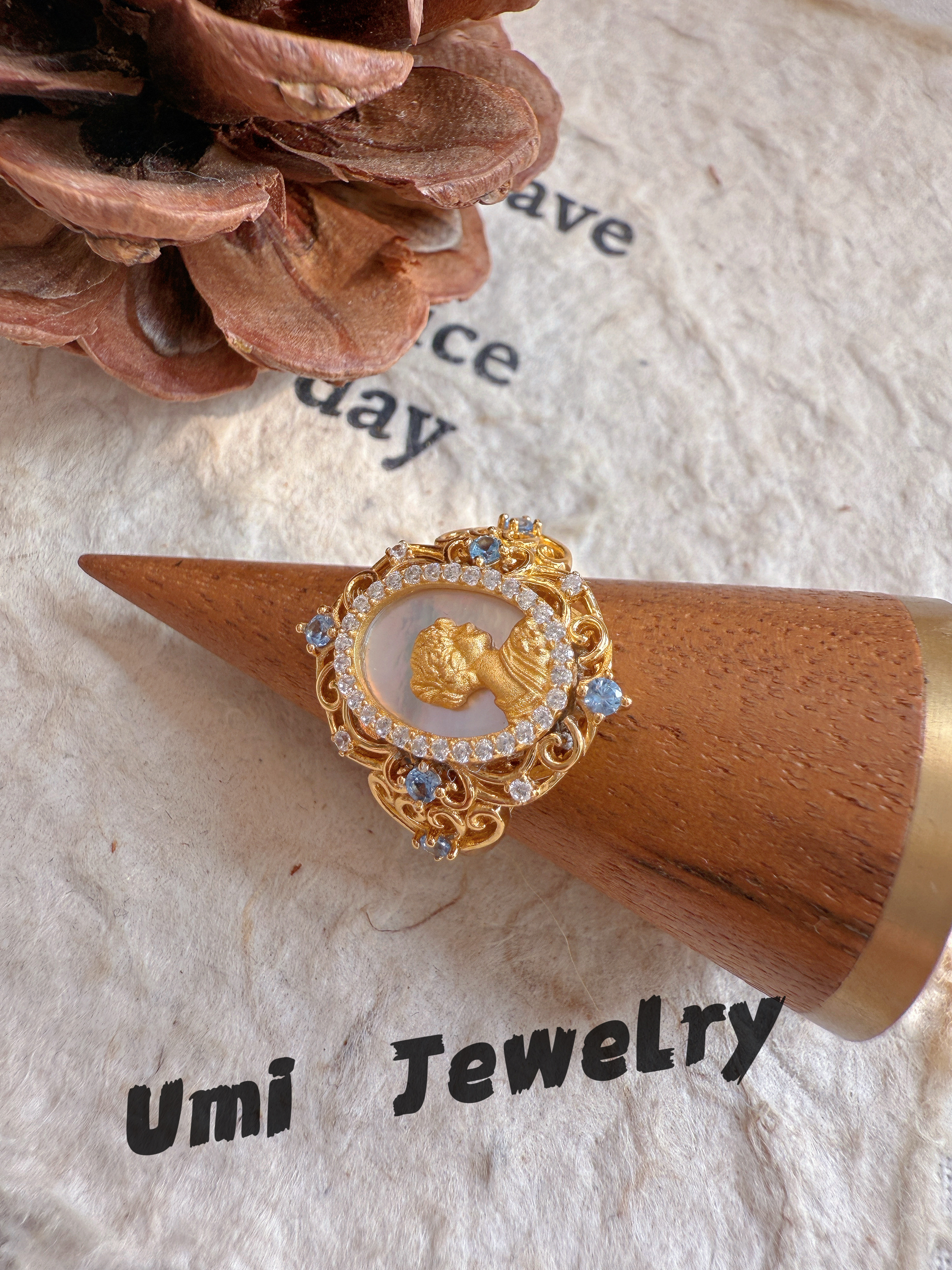 UMI家·轻珠宝/S925银镀k金·复古宫廷母贝蓝宝戒指vintage高级感