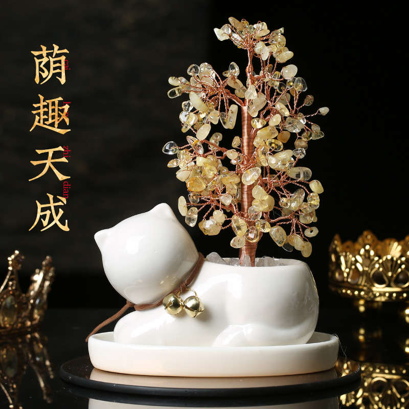 居龙阁小猫水晶树粉黄水晶发财树陶瓷白瓷可爱小动物水晶桌面摆件