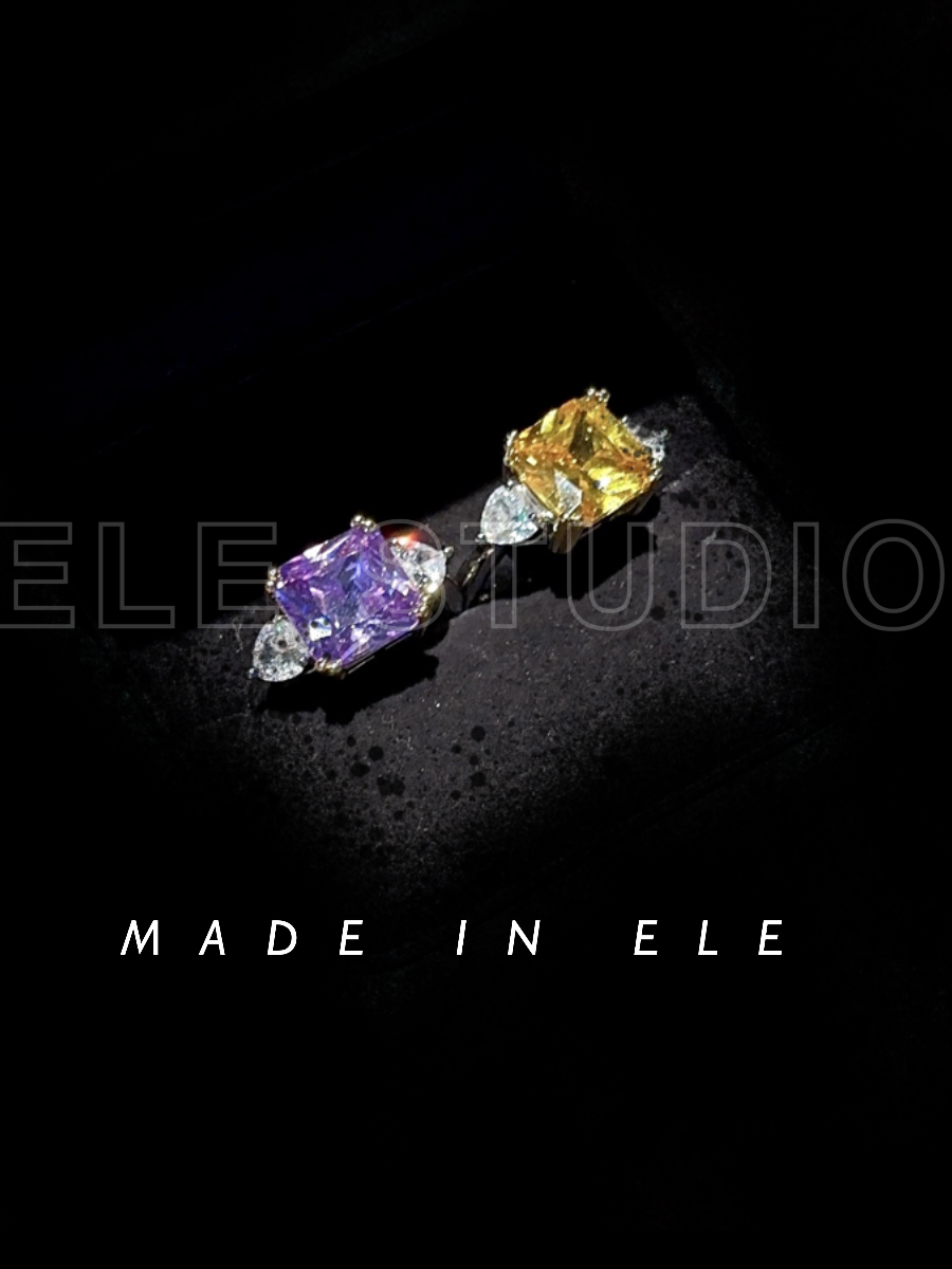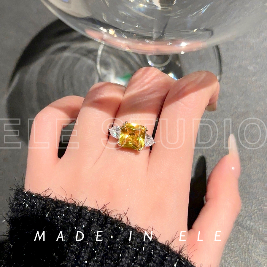 ELE饿了 黄钻方形冰花切戒指镶嵌锆石轻奢百搭小众设计高级感粉钻