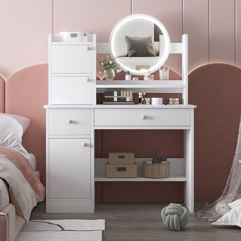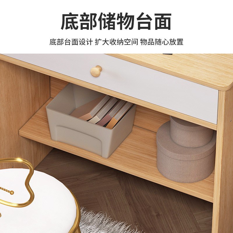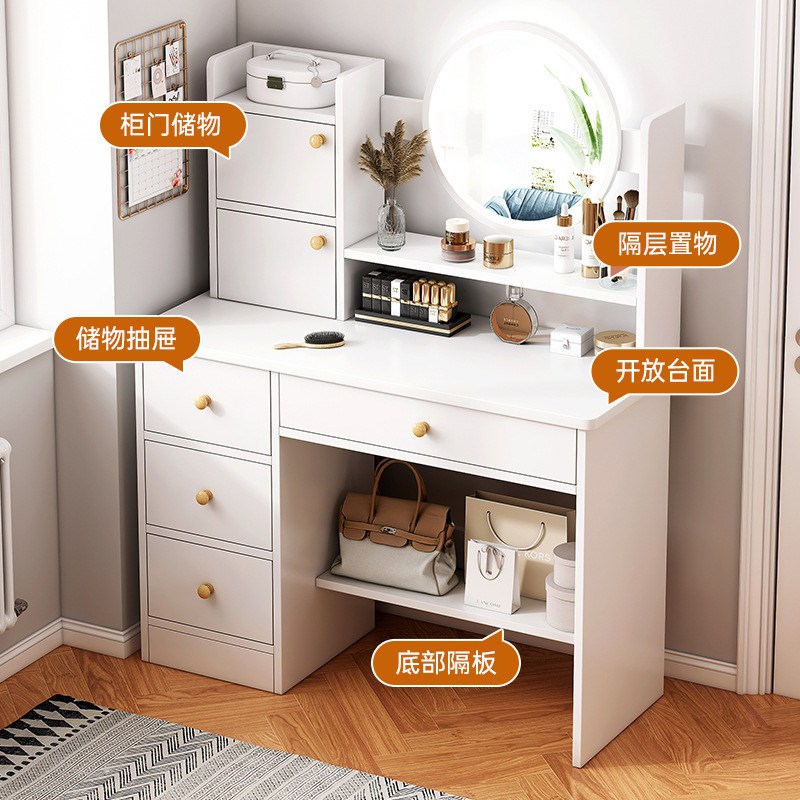梳妆台卧室简约现代小型多功能奶C油风化妆台带镜收纳柜一体桌椅