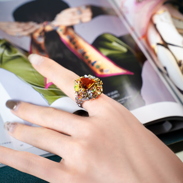 仿天然黄水晶彩色宝石戒指意大利宫廷珠宝工艺聚财高级感开口戒指