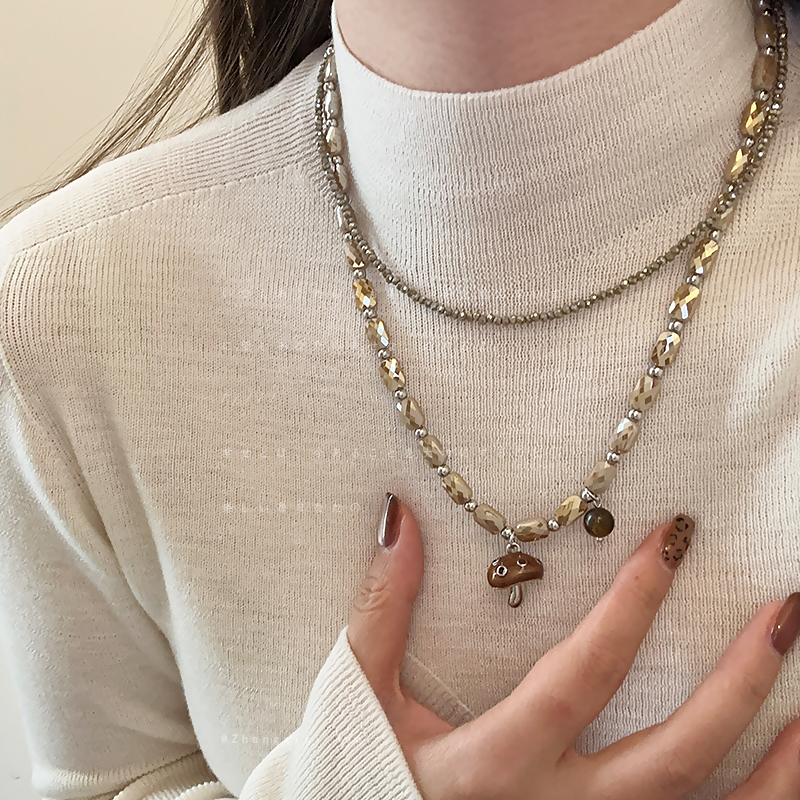 叠戴水晶串珠滴油蘑菇吊坠项链女甜美个性精致时尚百搭颈链毛衣链