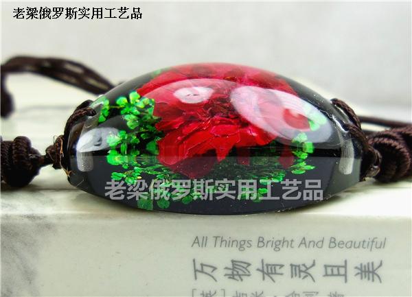 Z3鲜花水晶琥珀手链椭圆形黑色底绿叶红色巴西玫瑰 浪漫美好