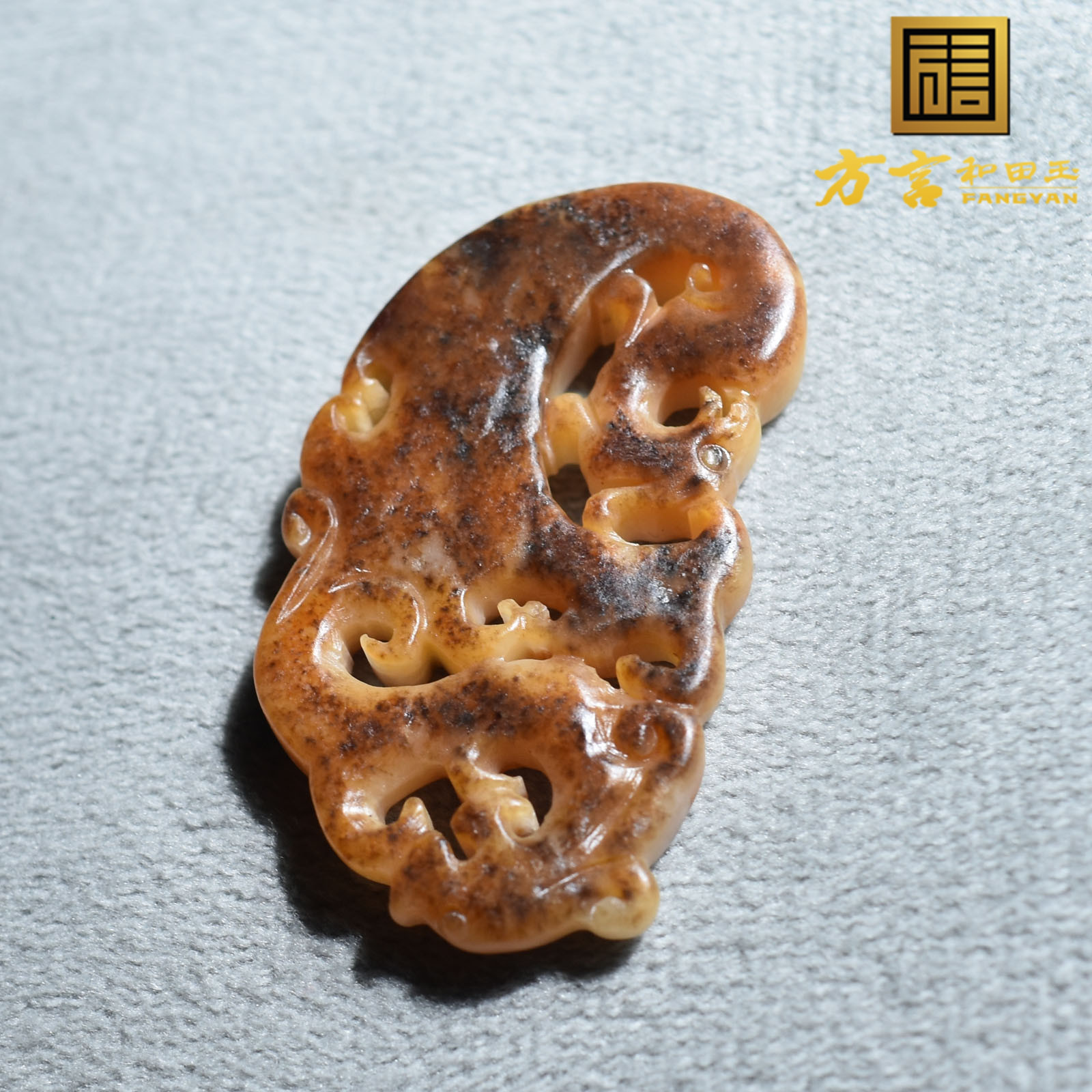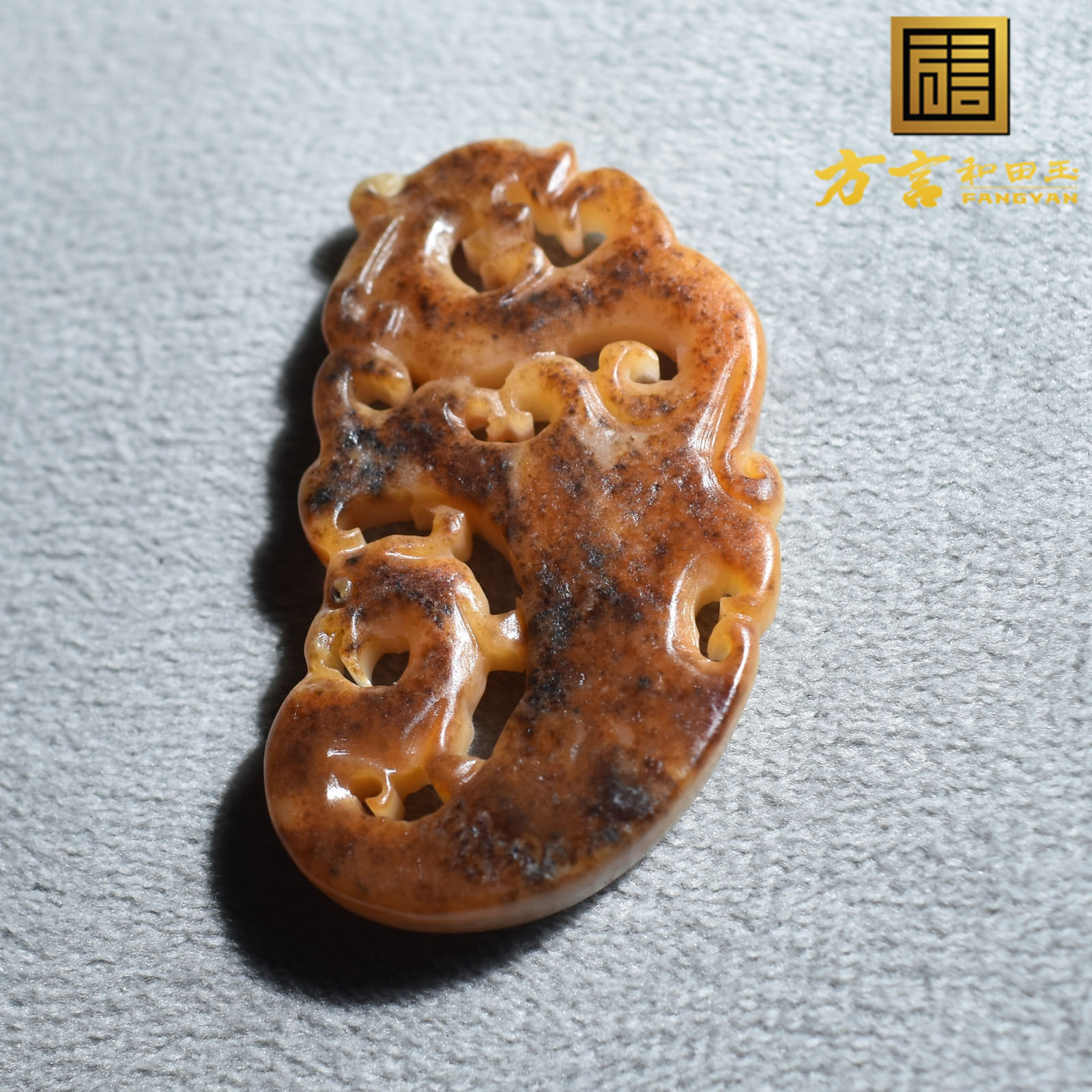 巨漏方言和田玉一眼真秋梨皮唐河料黄沁黄玉底仿古龙凤吊坠挂件R1
