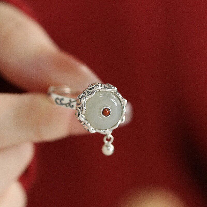 925银复古新中式旋转动戒指环唐草纹和田K玉莲花六字真言开口调节