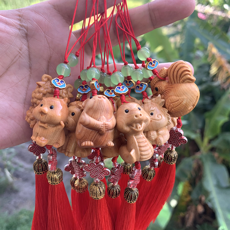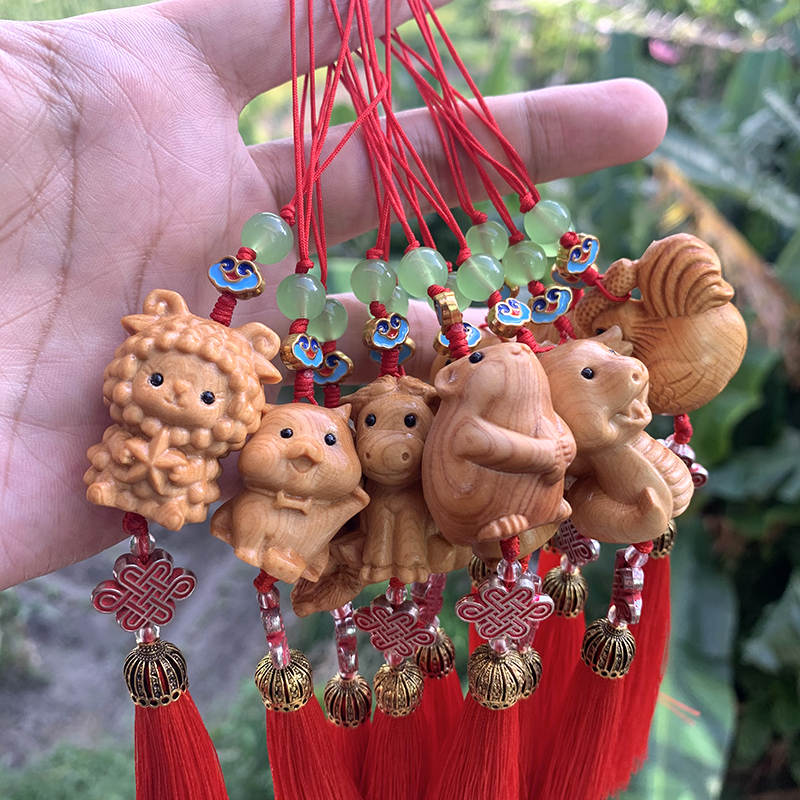 可爱迷你小猪挂件崖柏木十二生肖包包挂件钥匙扣带流苏车挂手机链