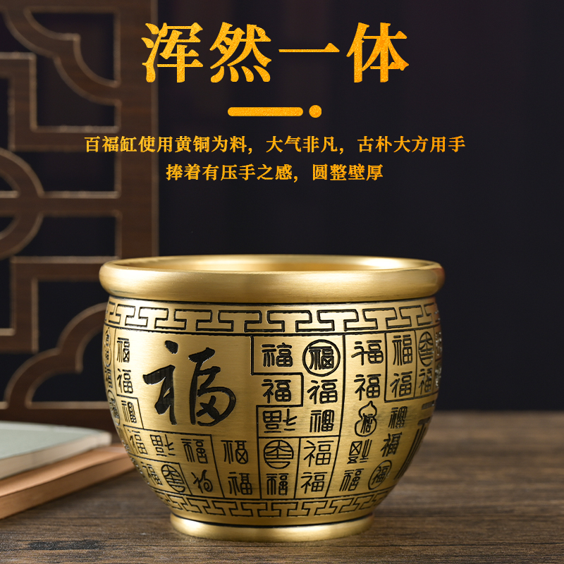 黄铜百福缸聚宝盆摆件客厅玄关铜缸装饰品办公室桌面招财进宝聚财
