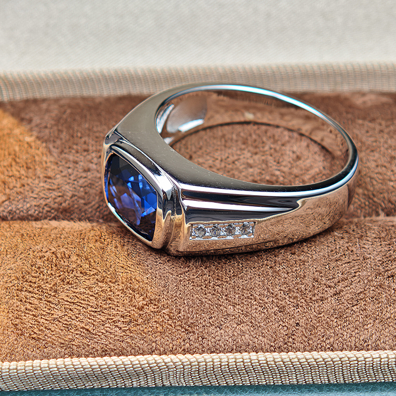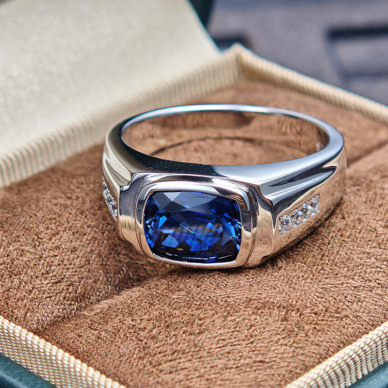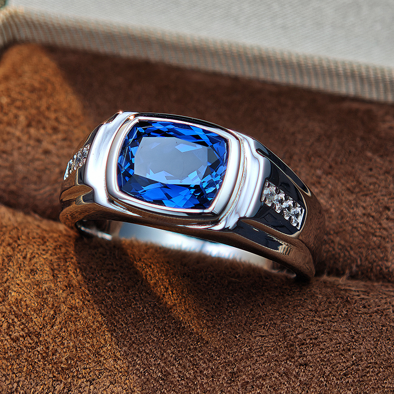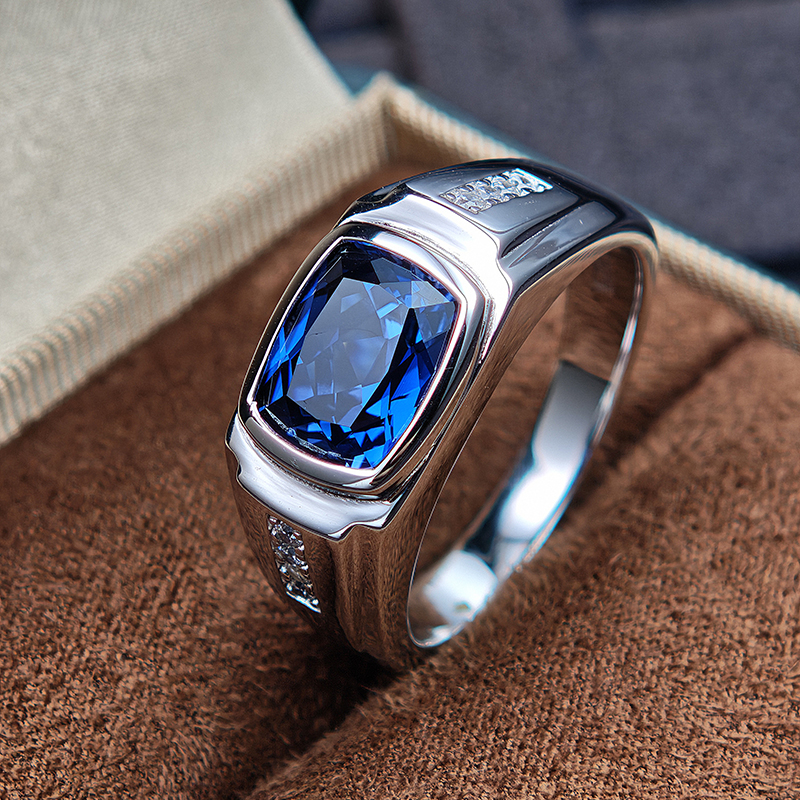 高级蓝宝石纯银镀金镶嵌宝石戒指男时尚潮人宝石指环食指银饰刻字