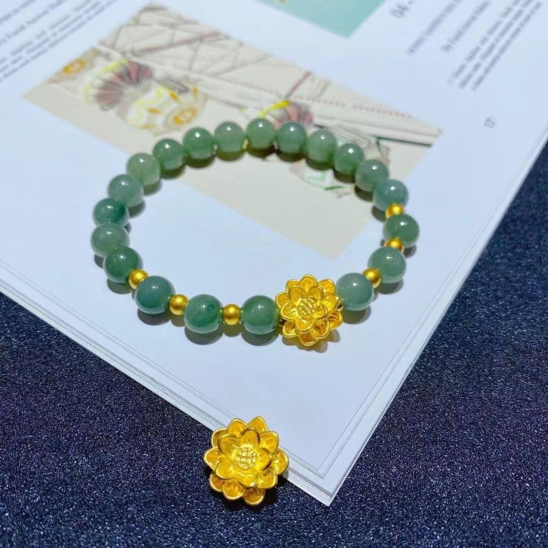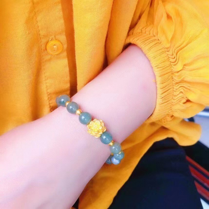 3D硬金黄金天然翡翠莲花手链足金999转运珠纯金手串女送妈妈礼物