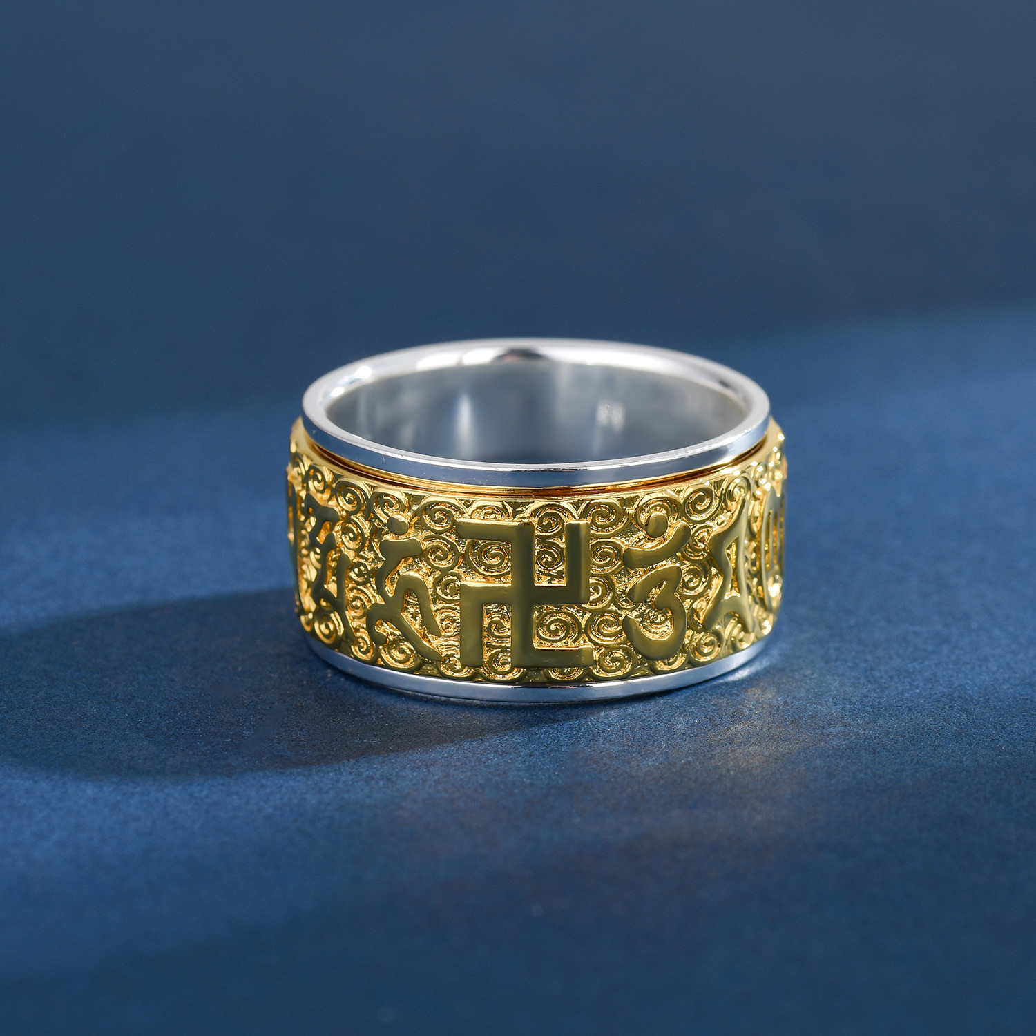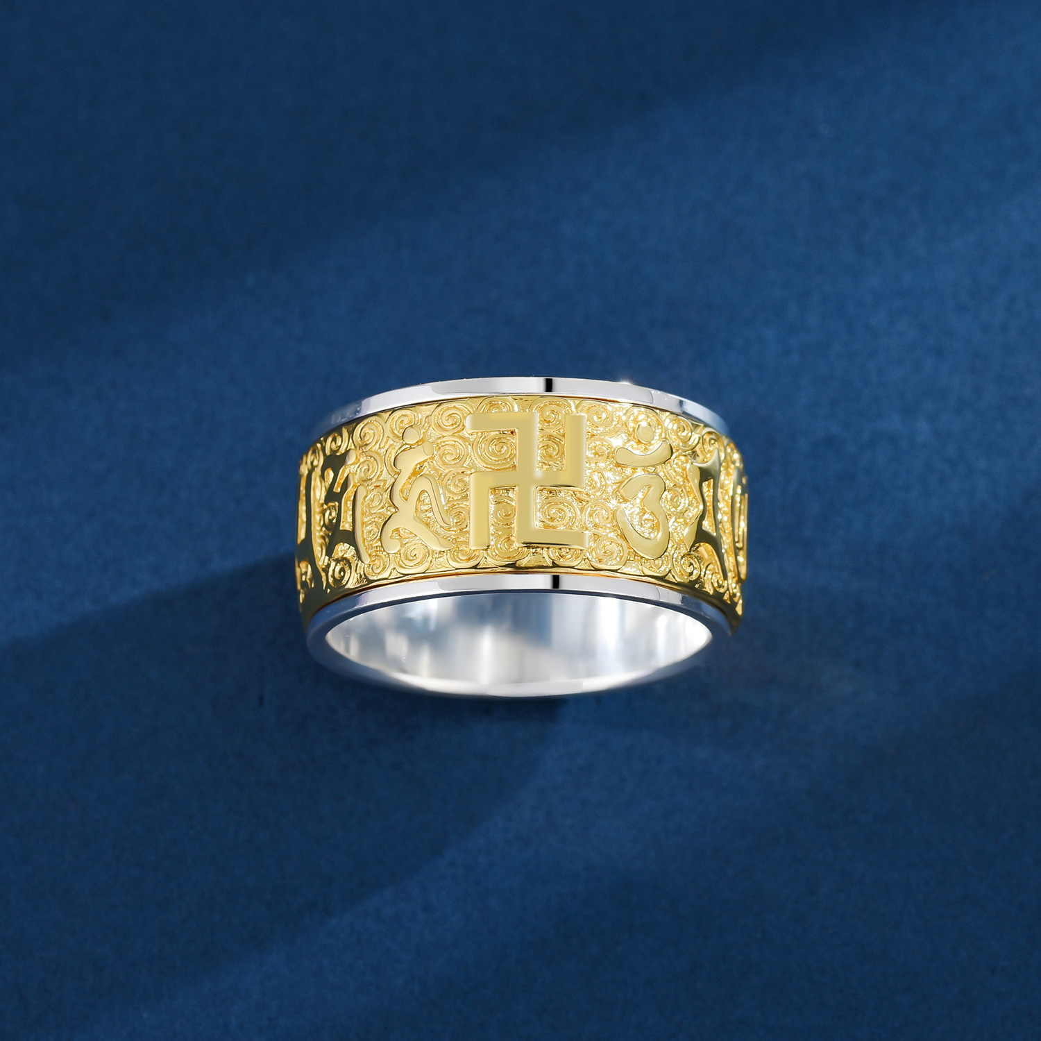 宽版霸气999纯银六字真言可转动戒指男款个性指环单身食指环礼物
