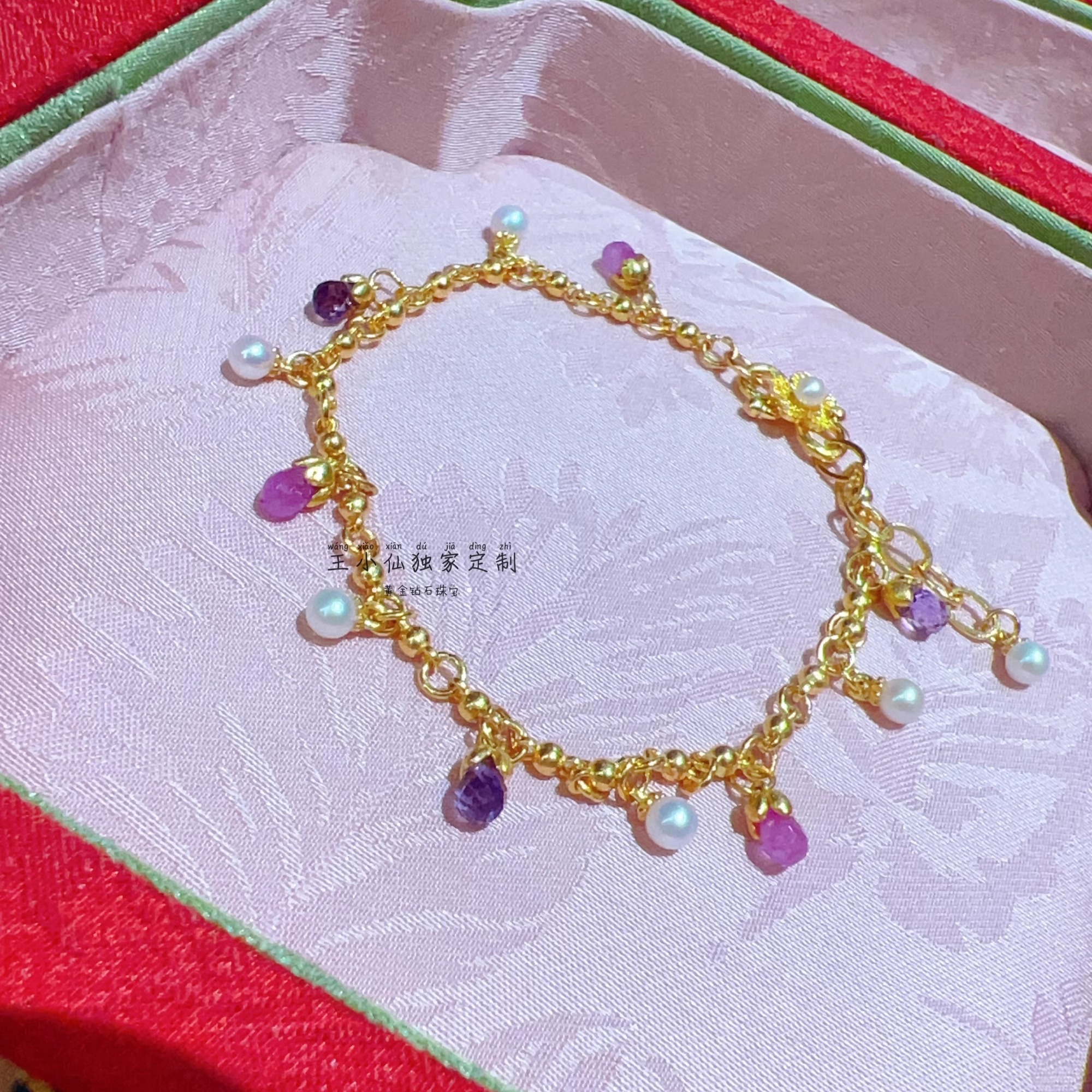 足金999手工古法金天然宝石水滴天然淡水珍珠提溜彩宝手串女