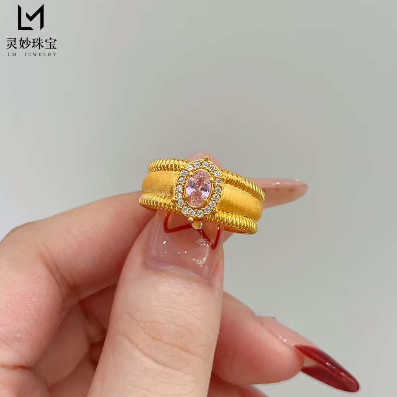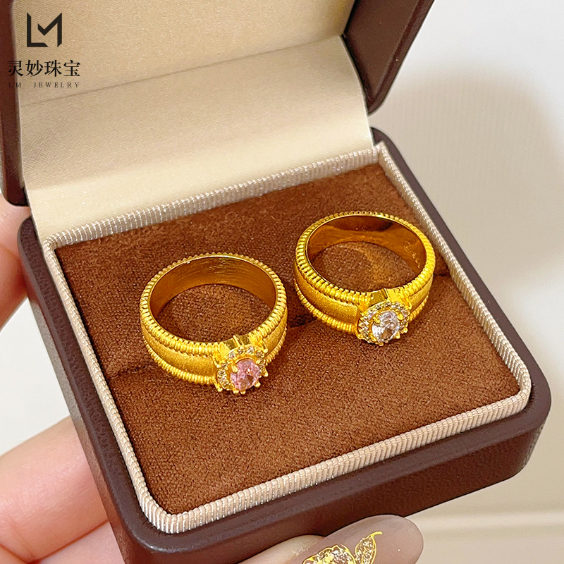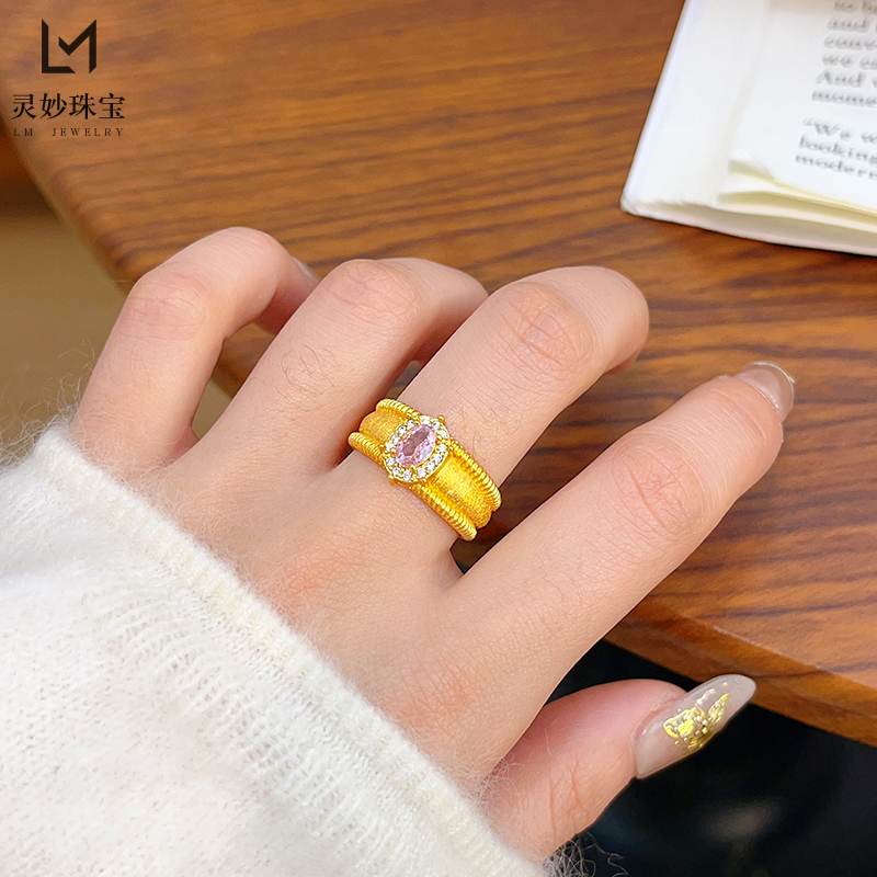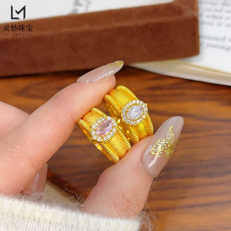 金店同款古法沙金点钻拉丝鸽子蛋戒指中古风轻奢气质送女朋友礼物