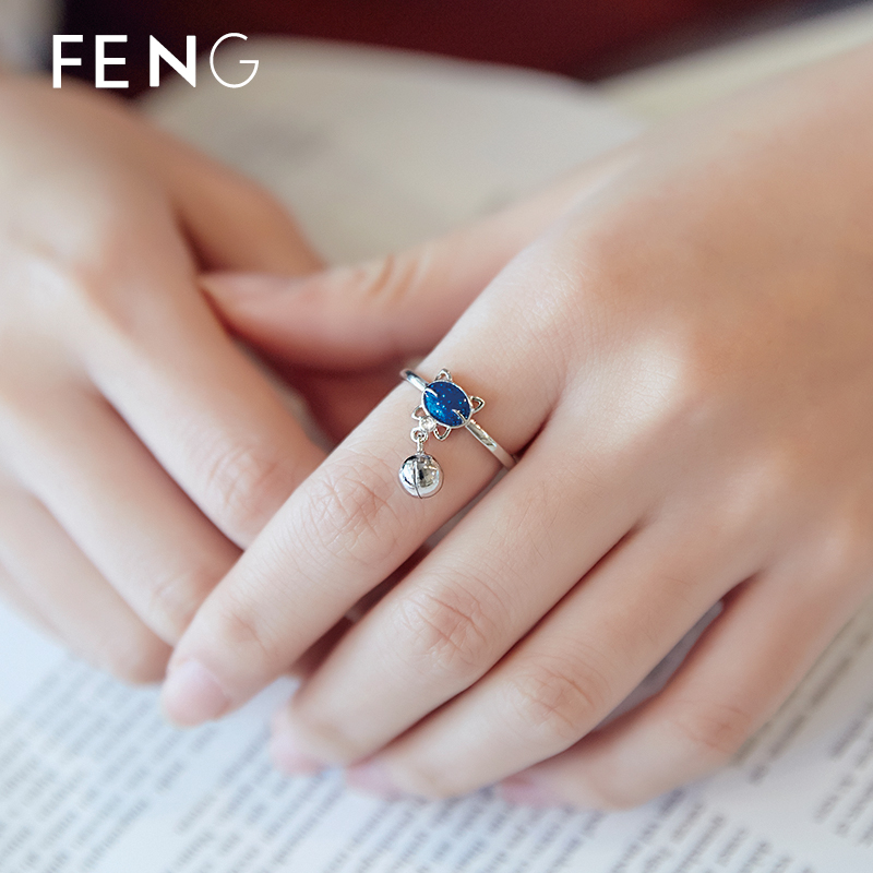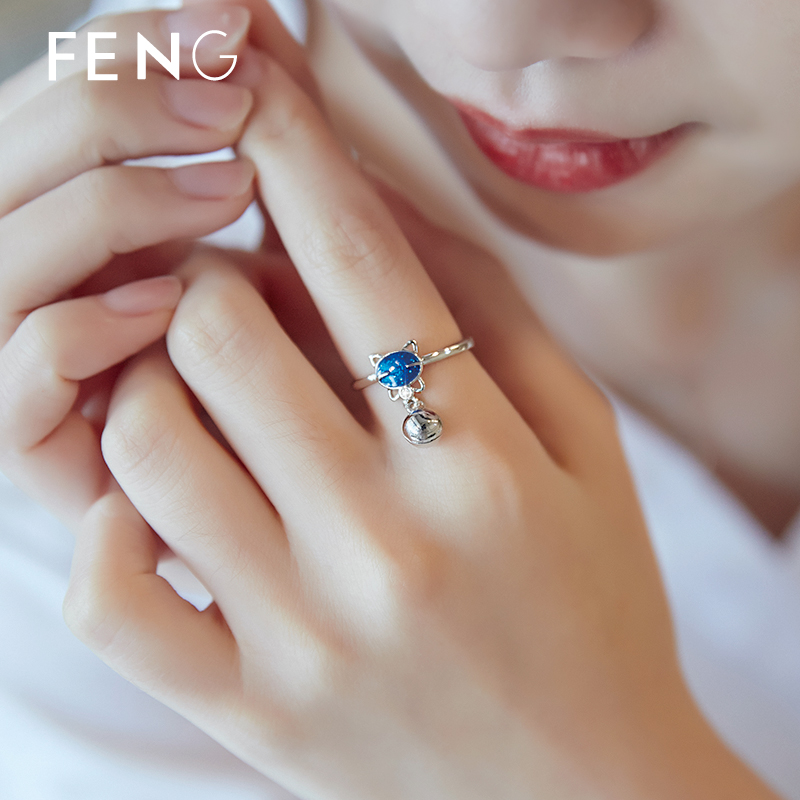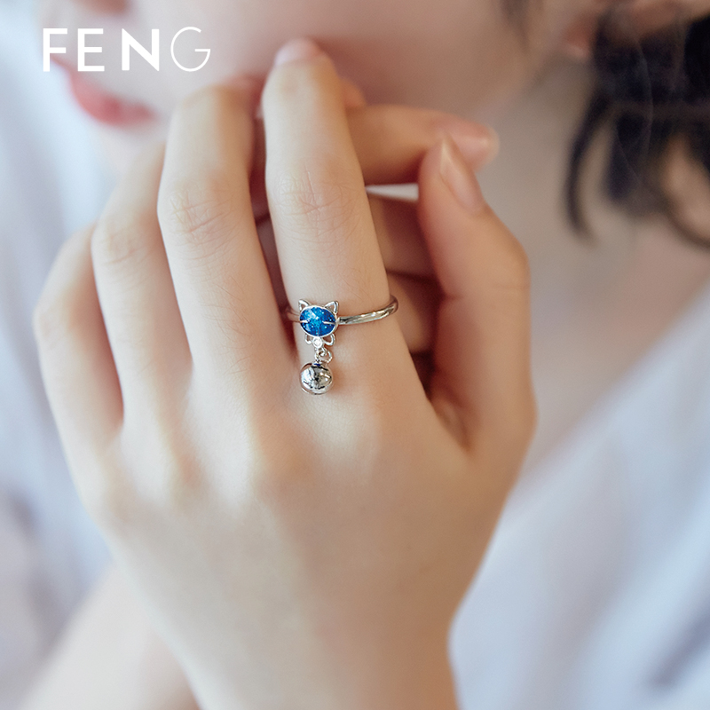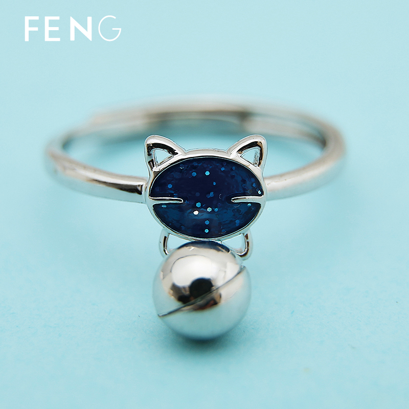 烽之银新款猫咪铃铛戒指女s925纯银开口食指戒网红送闺蜜刻字