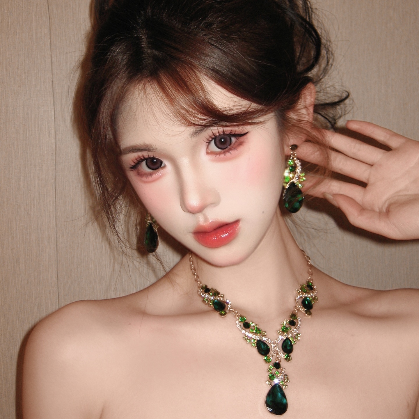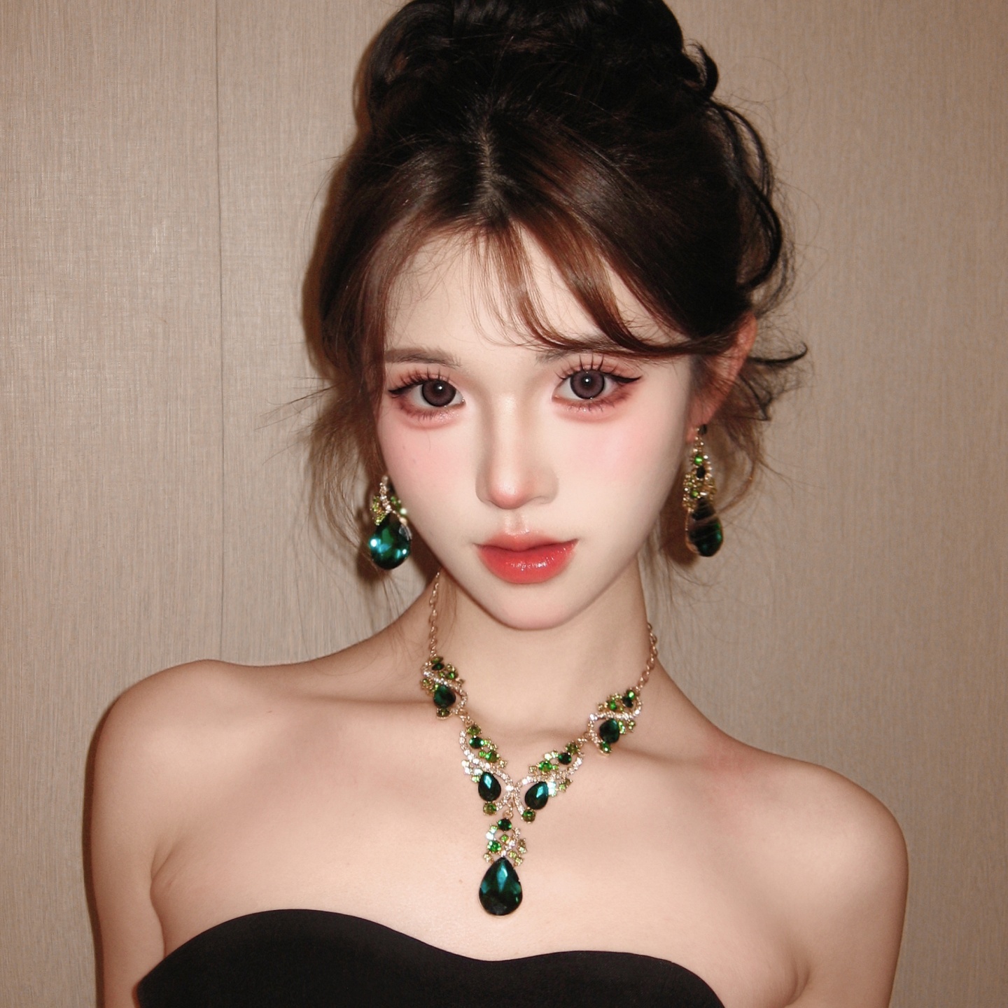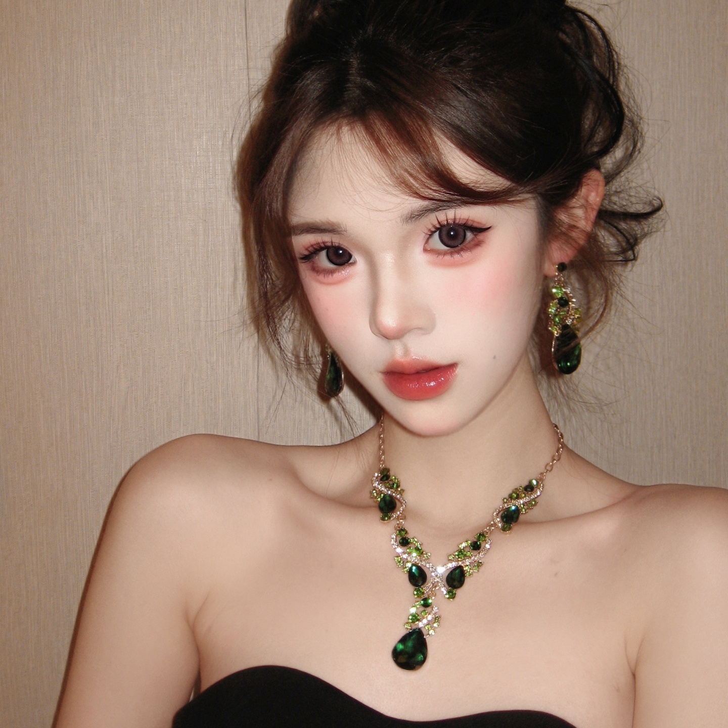 复古贵气感绿色项链耳环套装礼服配饰轻奢水滴夸张高级耳饰锁骨链