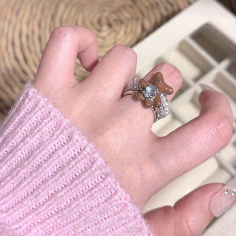 高品质~植绒小熊多层珍珠锆石水晶戒指套装项链女可爱设计感高级
