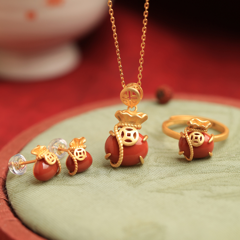 小银匠天然南红纯银福袋戒指女中式国风轻奢本命年红色玛瑙金包银