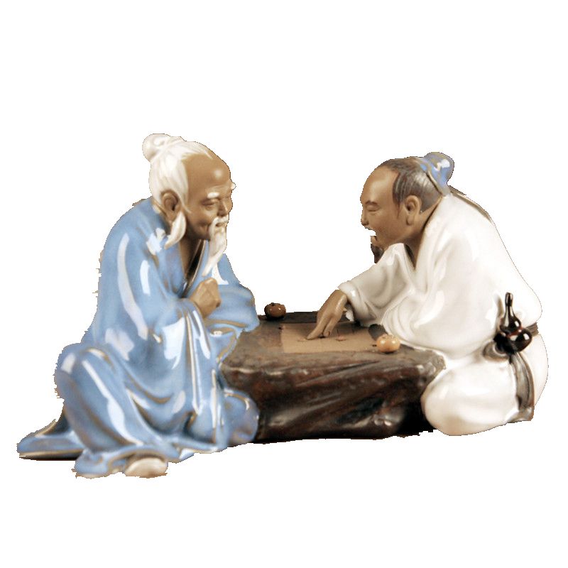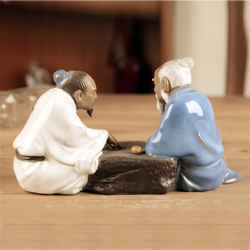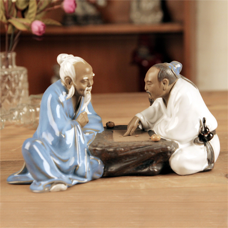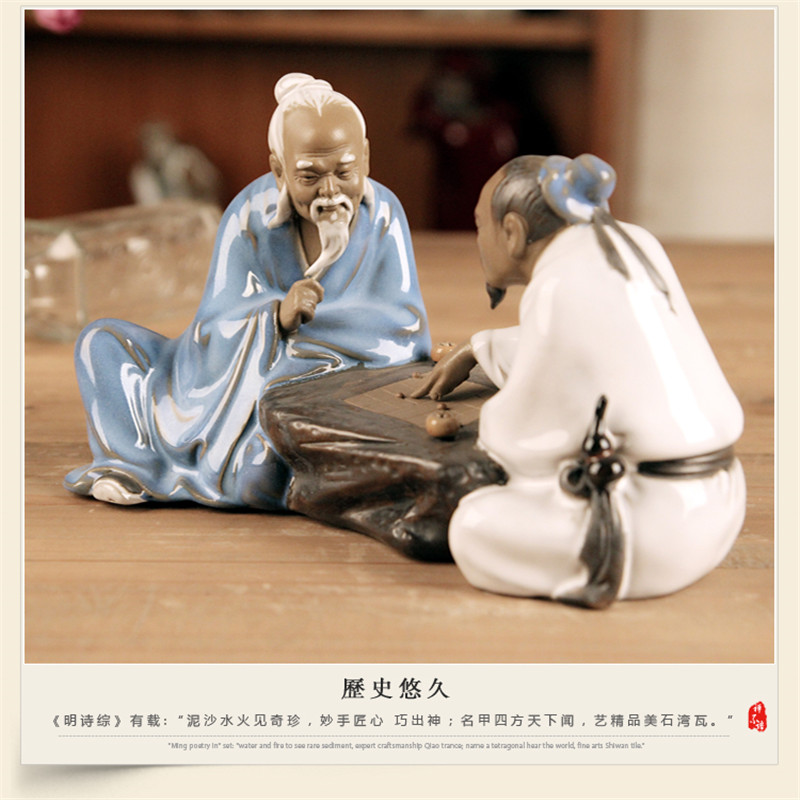 石湾公仔 陶瓷中式客厅电视柜玄关摆件假山盆景人物雕塑 围棋对弈