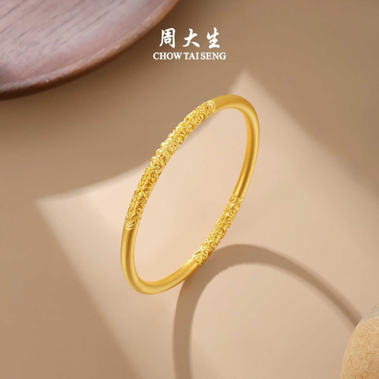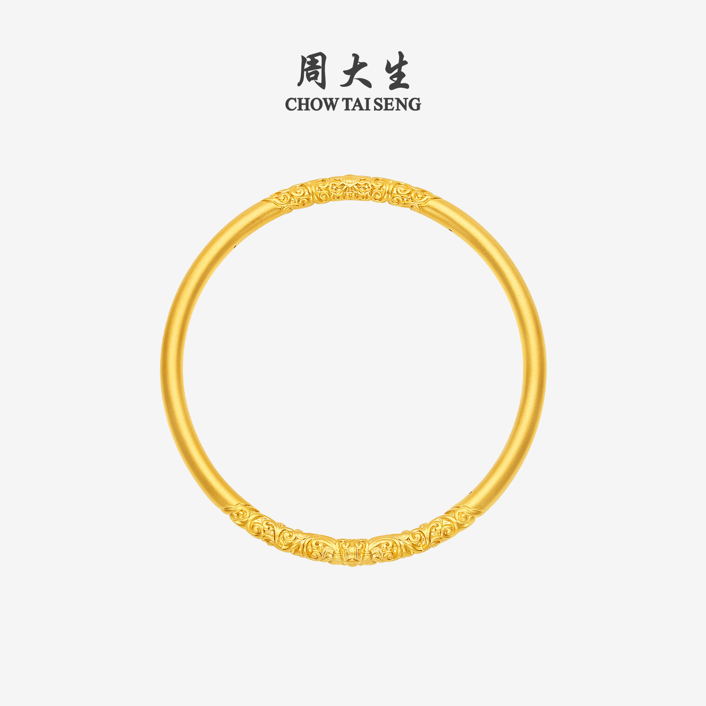 周大生黄金手镯女足金硬金卷草纹镯子素圈拉花镯圣诞礼物送女朋友