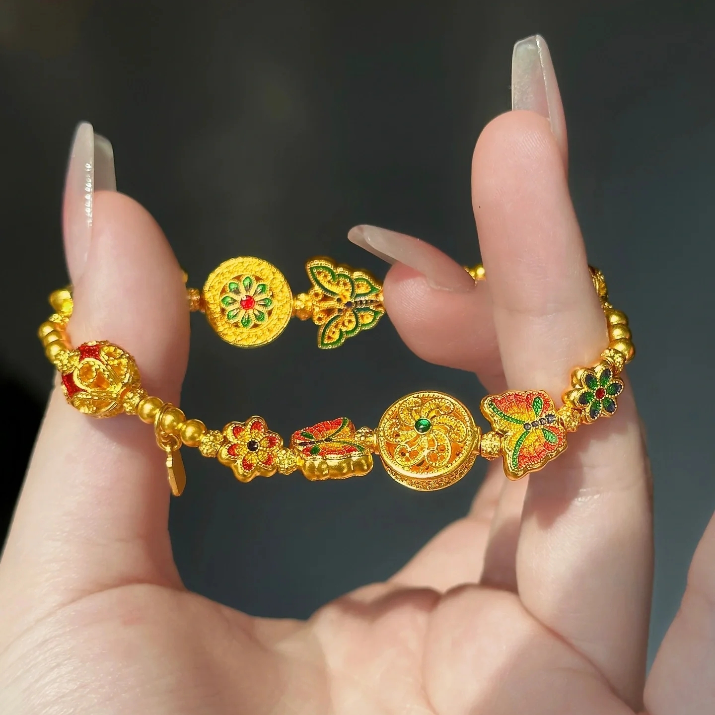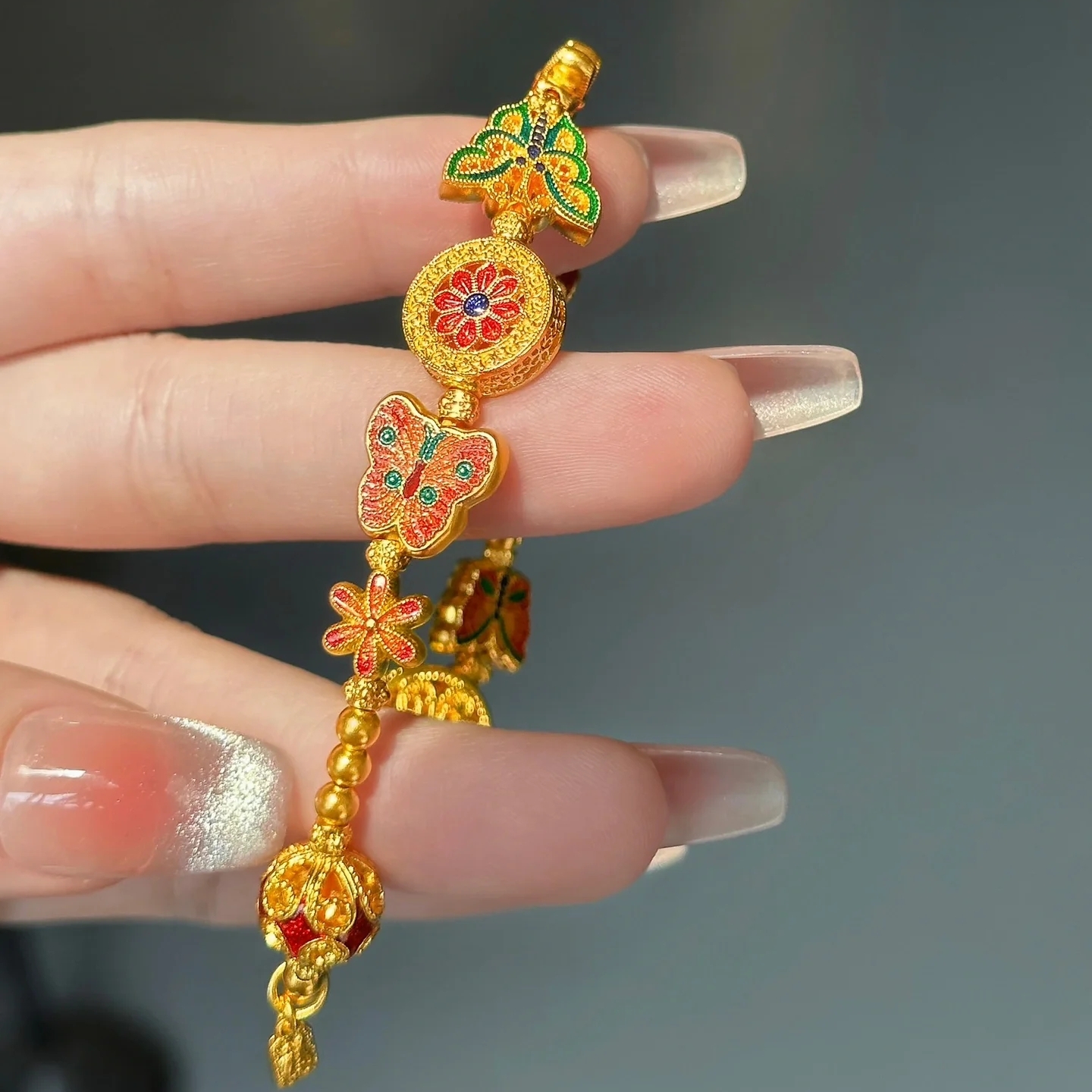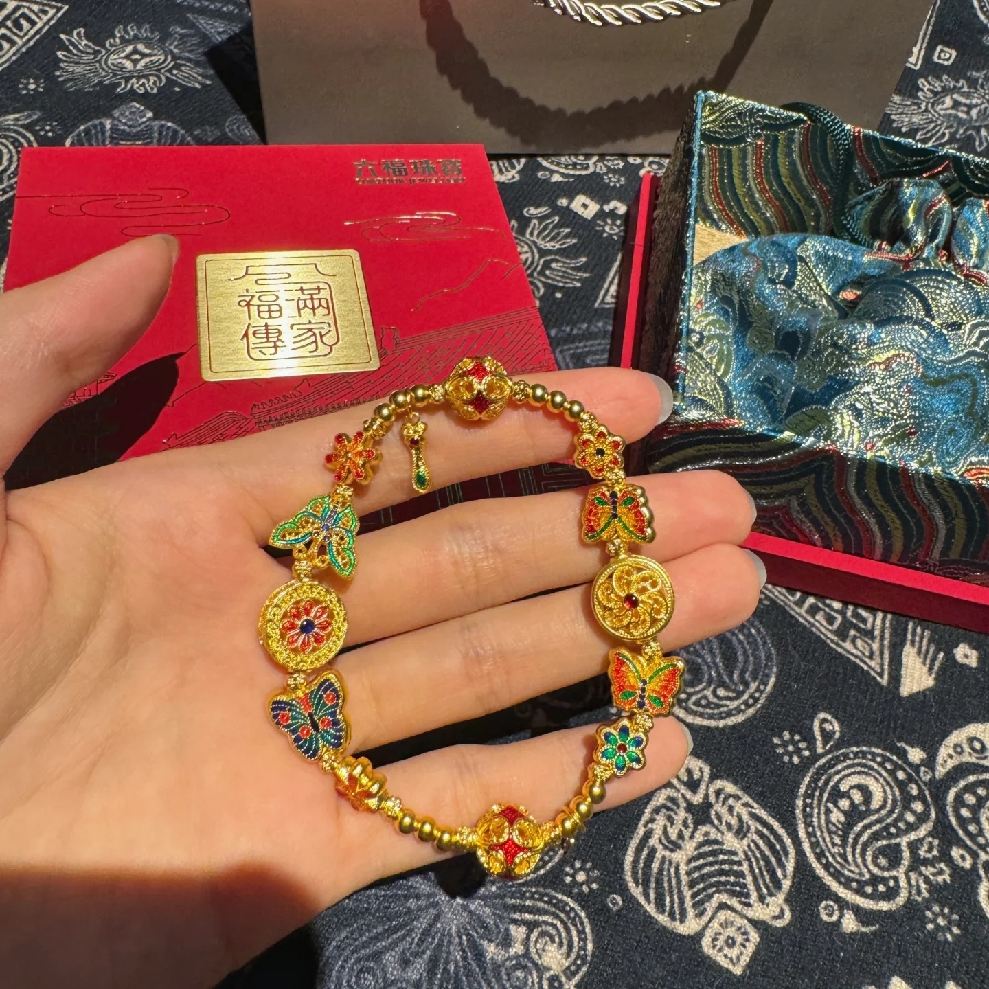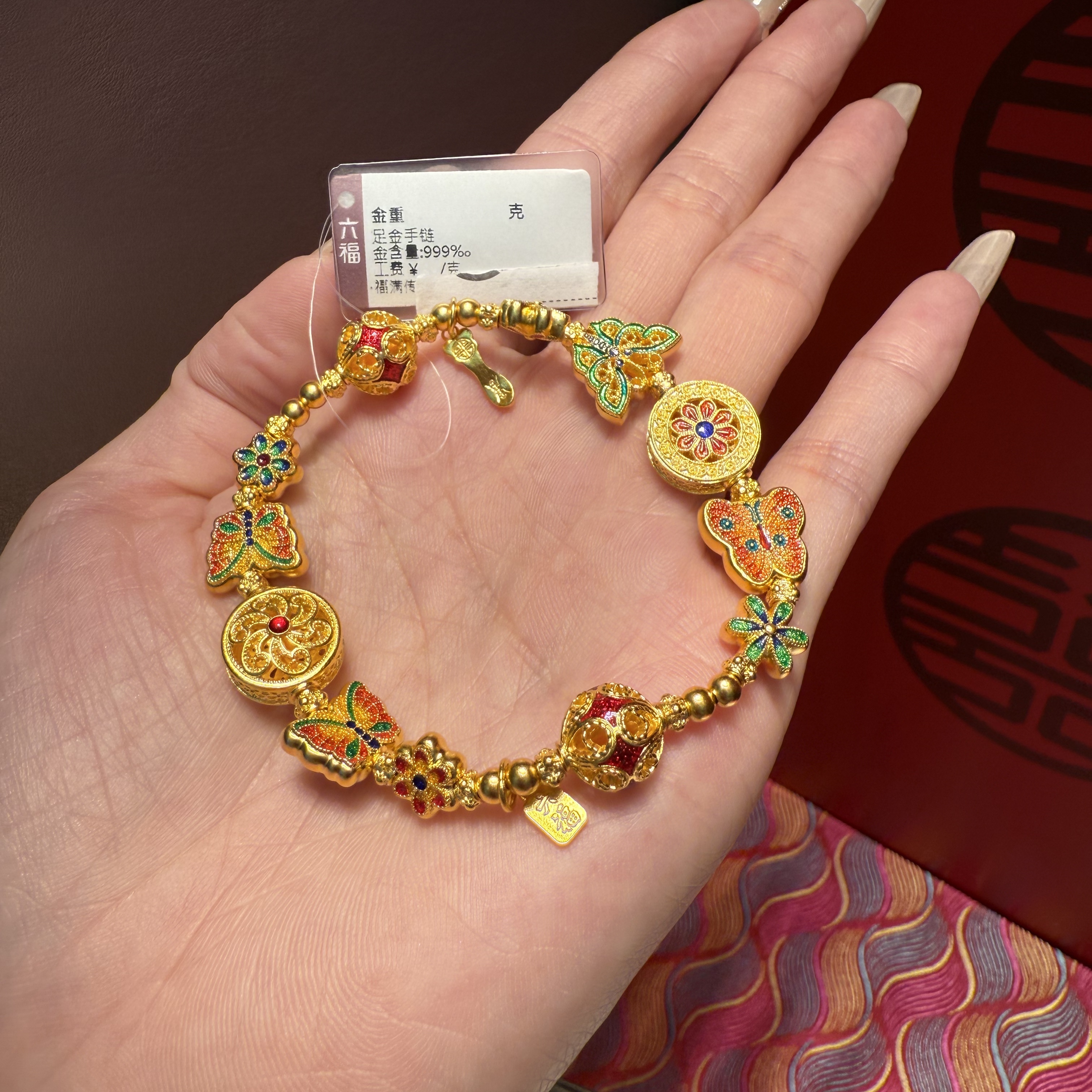 六福珠宝代购 福满传家系列花丝蝴蝶鎏彩足金黄金手链 专柜正品