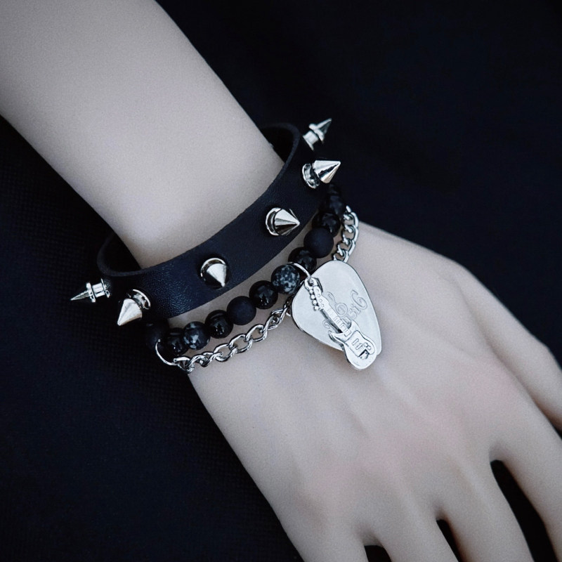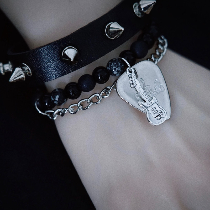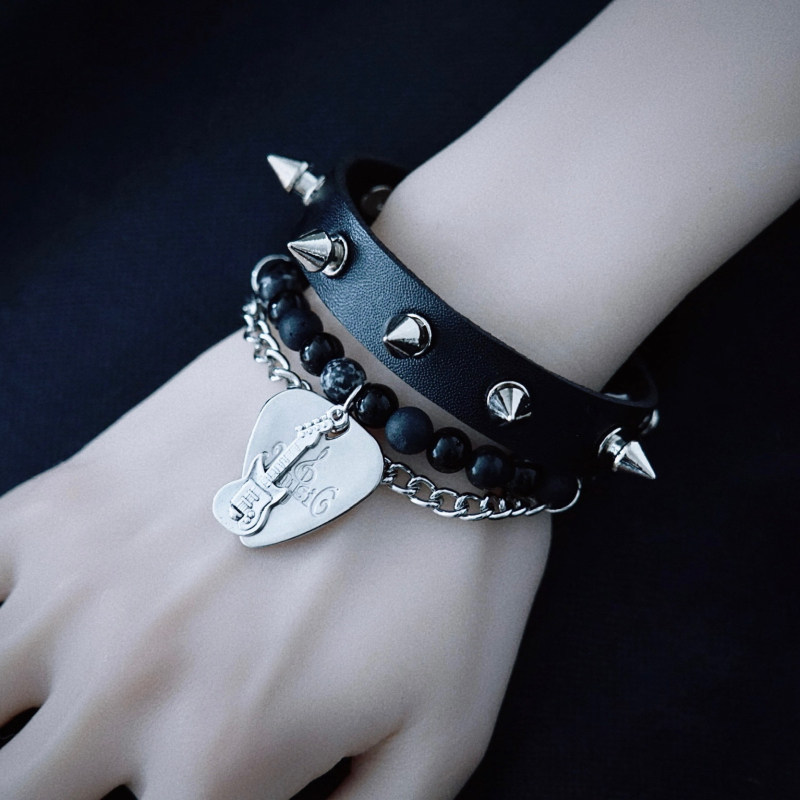 怪糖饰物集原创手工吉他吊坠珠串手链铆钉仿皮手环亚文化朋克黑色