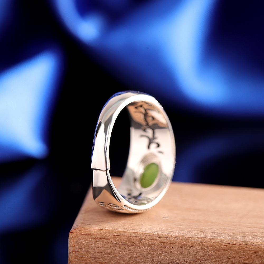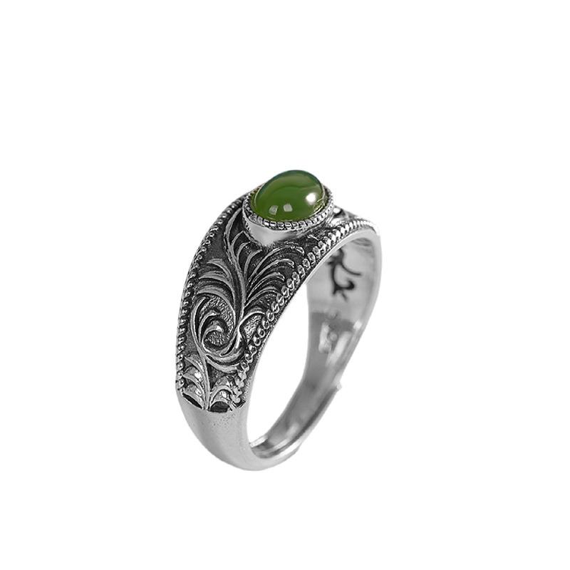 本命年925银复古镶嵌和田碧玉蛋面戒指时尚唐草纹简约开口指环礼
