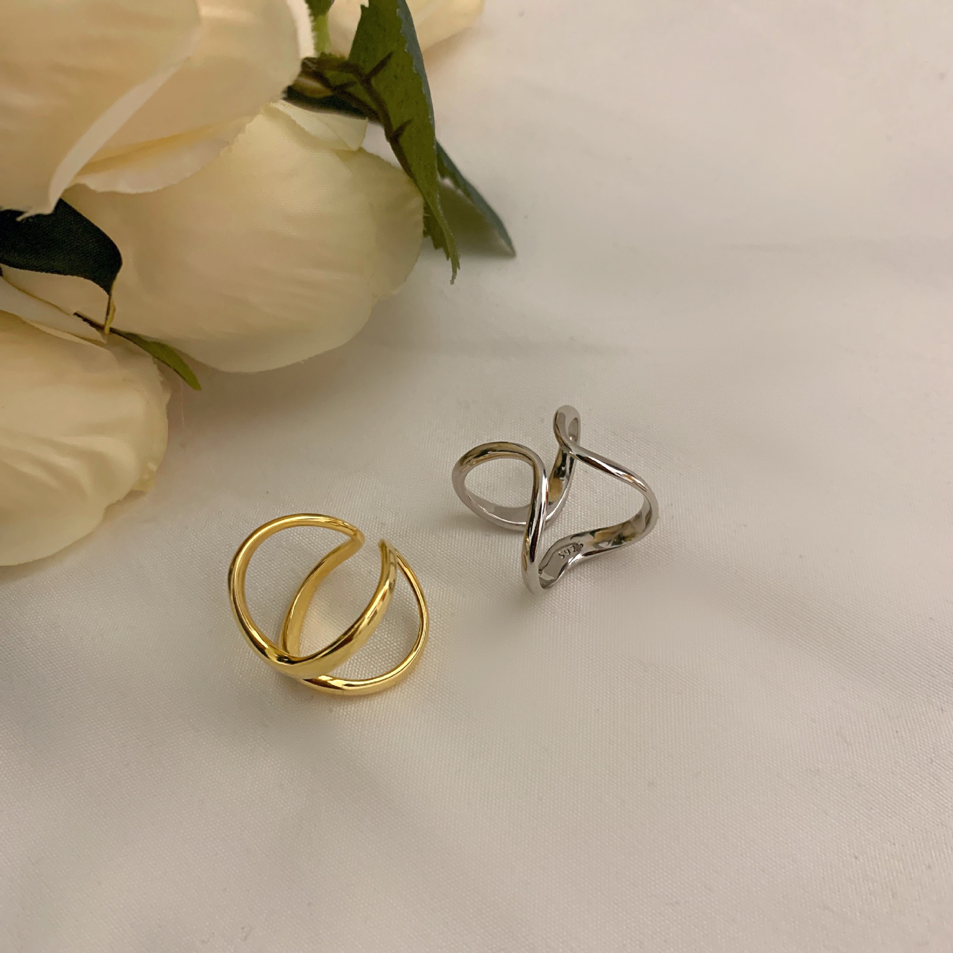 韩版ins简约波浪戒指女925银欧美金色复古不规则双层开口食指环潮