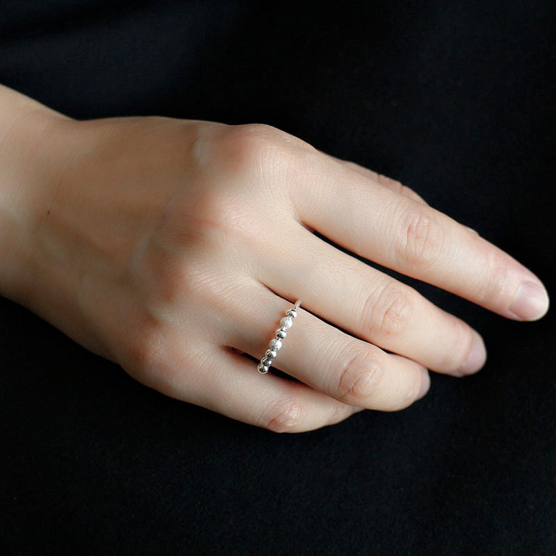 S925纯银磨砂珠子转动开口戒指串珠圆珠指环简约个性韩版银饰女