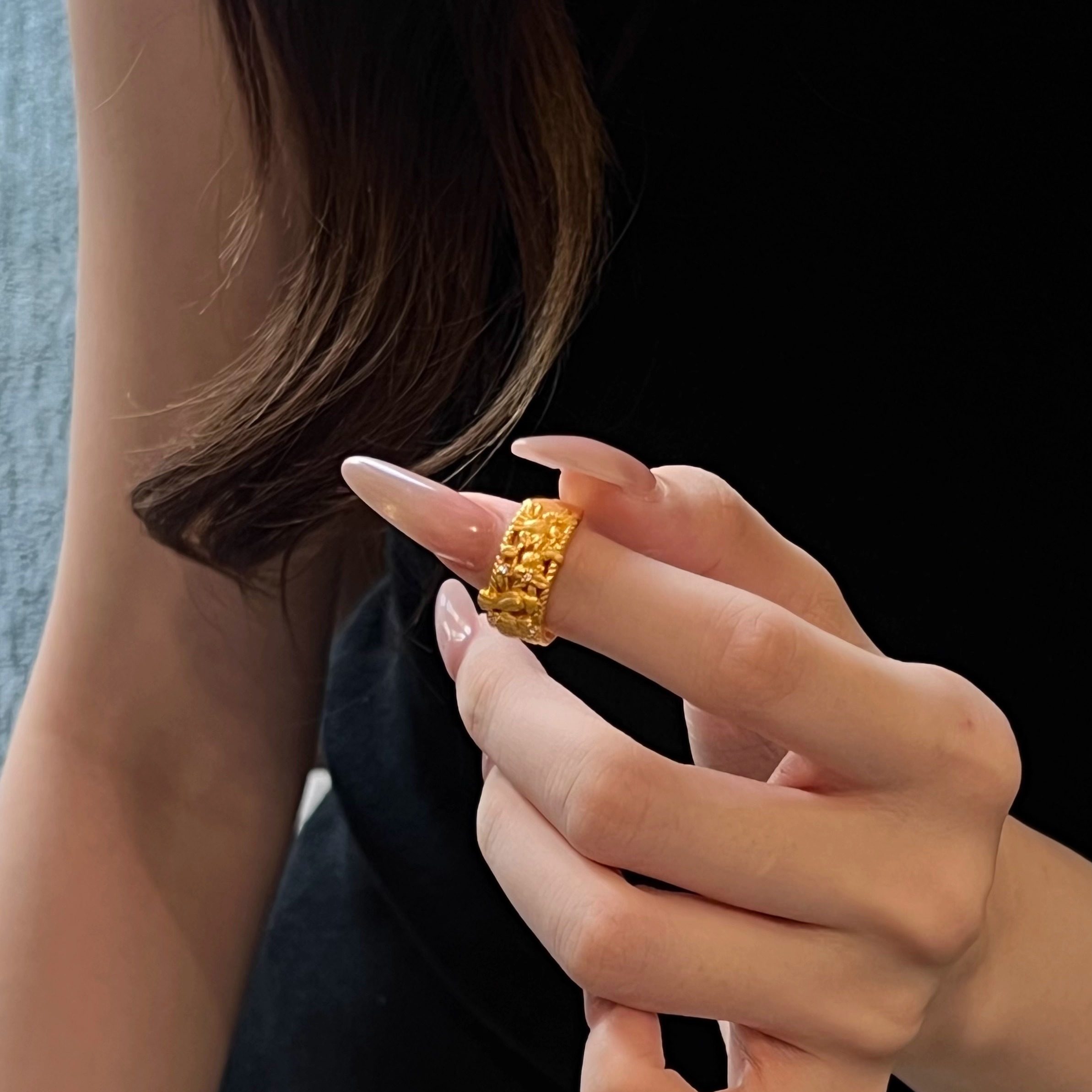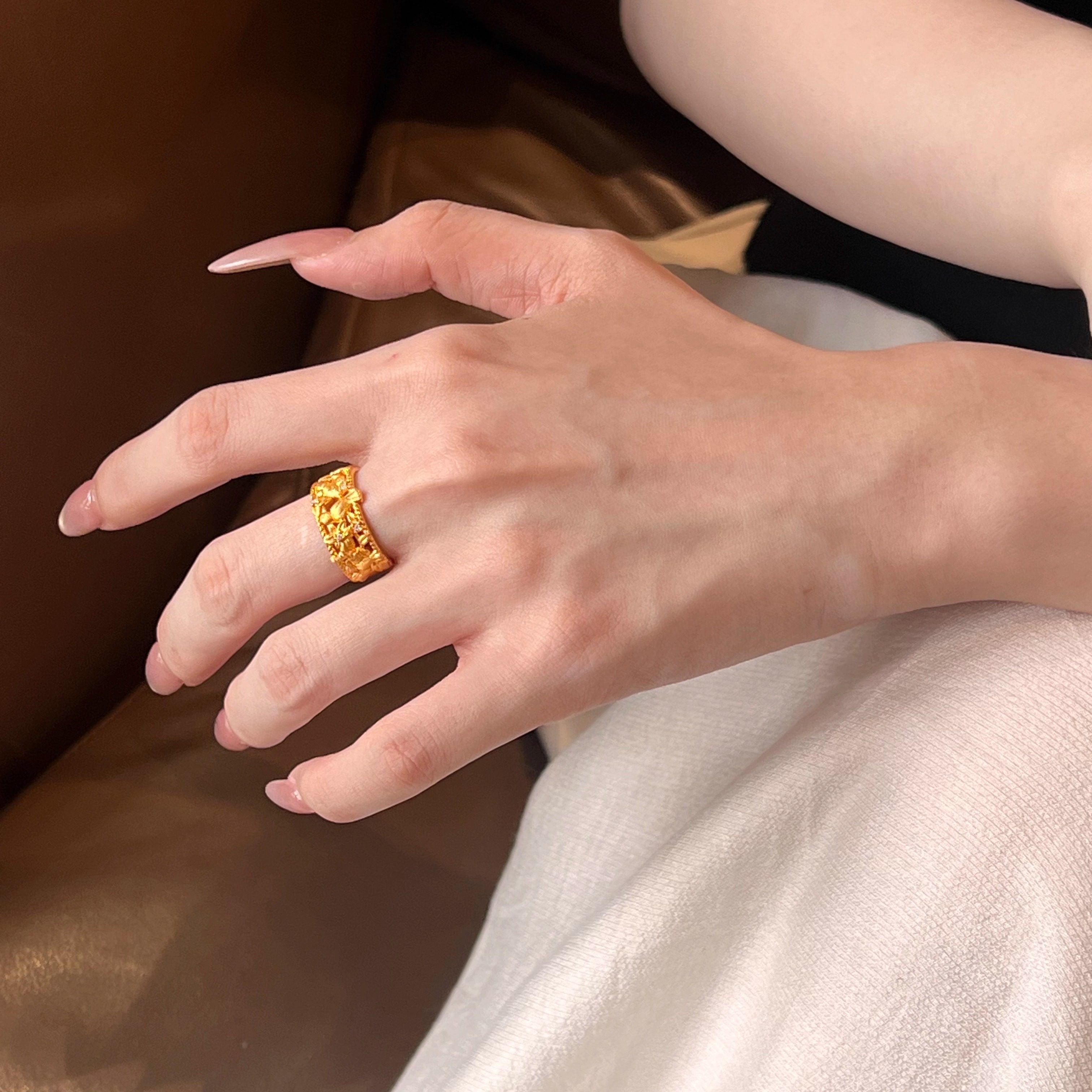5D足金999镶嵌钻点钻硬金版喜鹊登梅戒指新款2025水贝黄金送礼