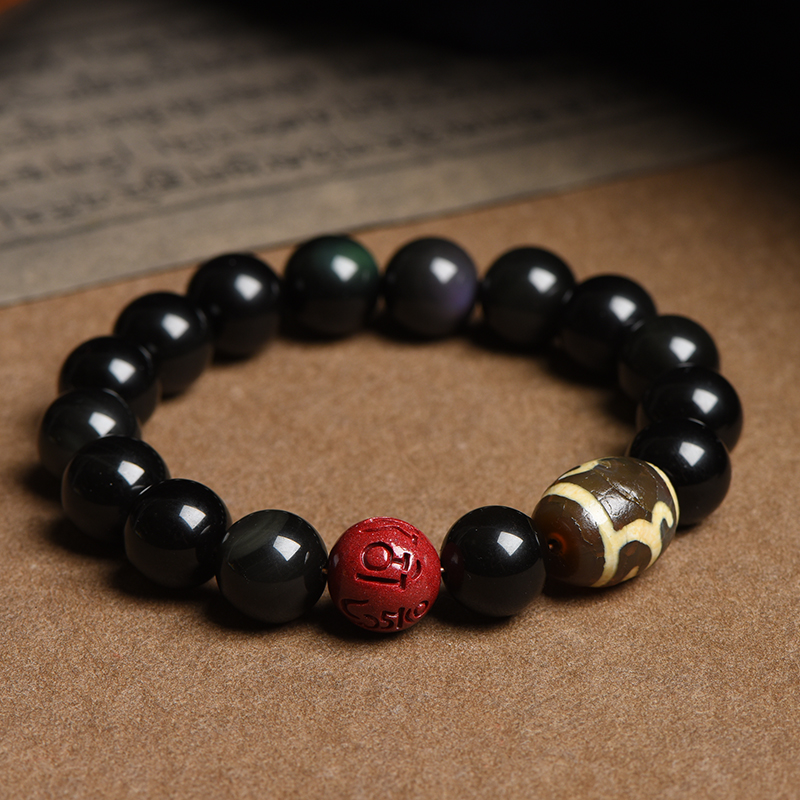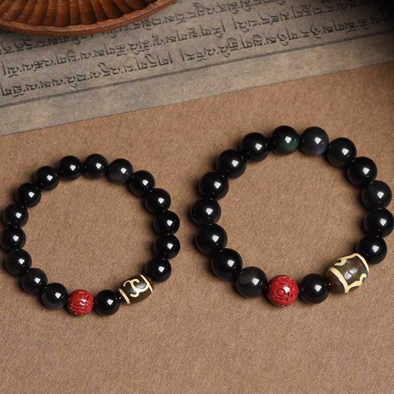 九转喜合天珠玛瑙本命年天然西藏真品黑曜石手链原石朱砂手串情侣