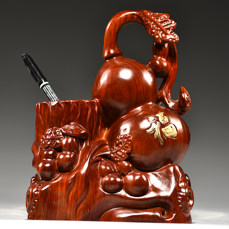 花梨木雕葫芦笔筒摆件实木质文房办公室书房用品家居客厅工艺礼品