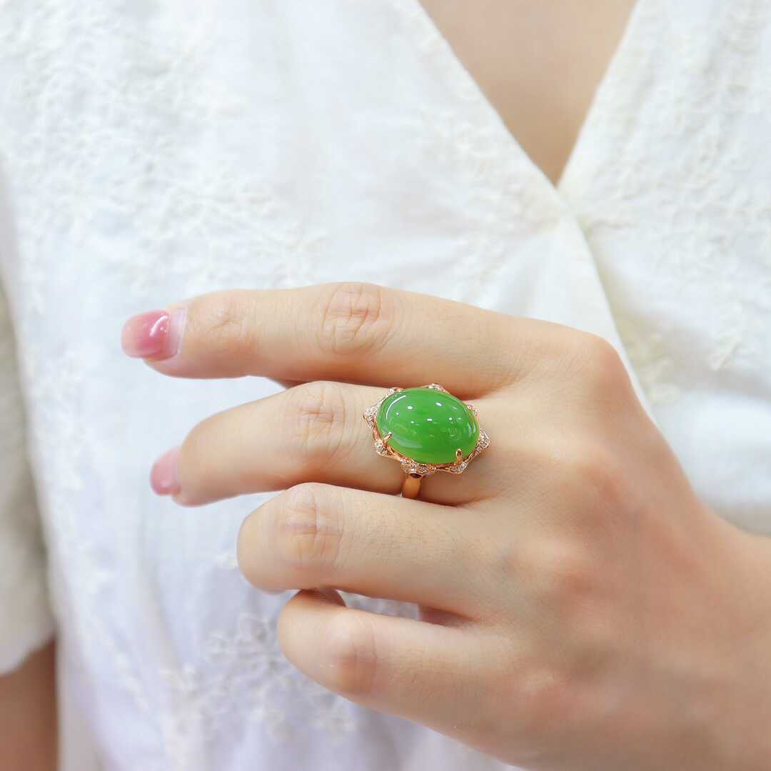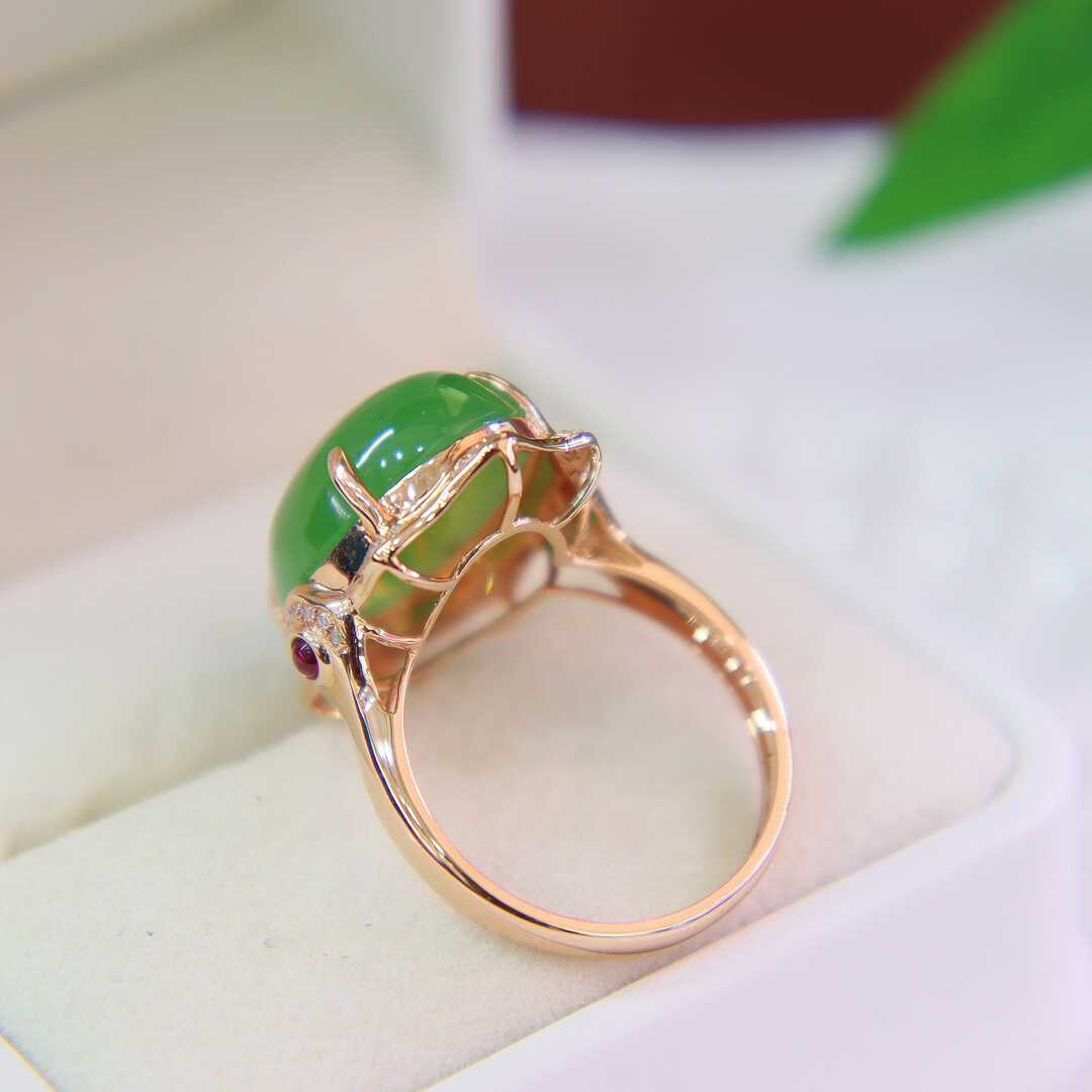 暑期礼品和田玉戒指金镶玉a货玉石正宗苹果绿碧玉蛋面镶18k金指环